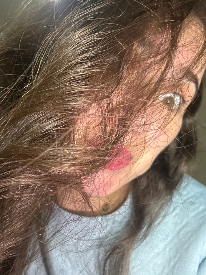 A close-up shot of a woman's face partially obscured by brown hair. Her eye is visible, gazing upward. Red marks are visible on her cheek. The background shows a blue fabric. The overall impression isβ¦read more