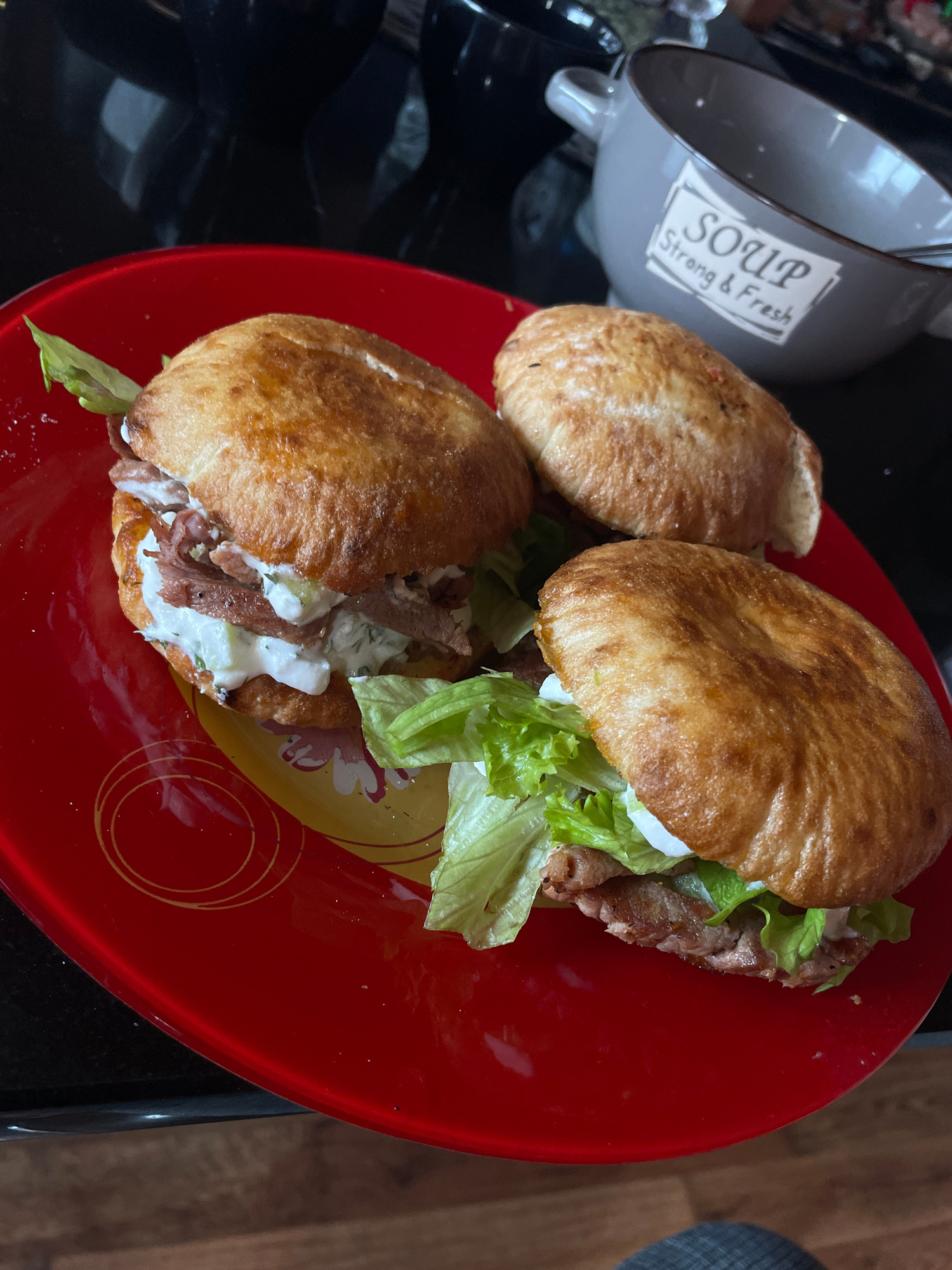 The image depicts a close-up shot of a red plate containing what appear to be two and a half sandwiches, likely gyros or similar pita-based sandwiches. The sandwiches are composed of toasted pita brea…read more