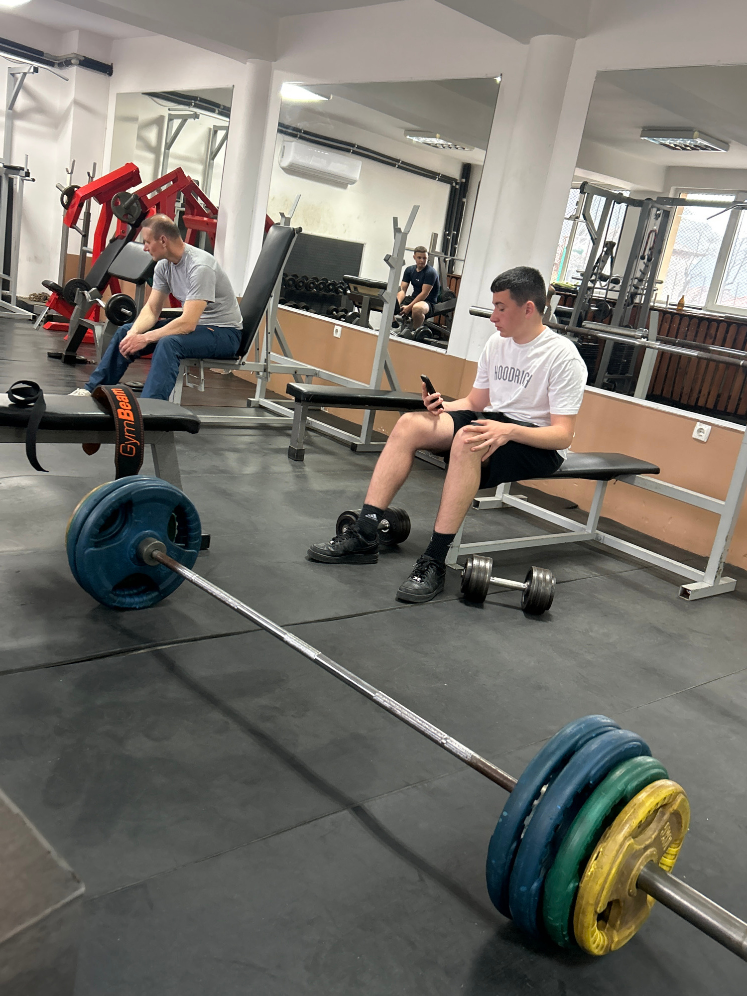 The image depicts an indoor gym setting in Zlatograd, Bulgaria, during daytime. The scene is captured with a slightly tilted perspective, focusing on the workout area. In the mid-ground, a young man…read more