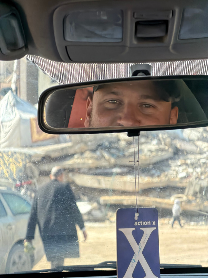 From inside a car, a rear-view mirror reflects a person's face. An "action X" branded air freshener hangs nearby. Through the windshield, the outside view is blurred but suggests a street scene with p…read more