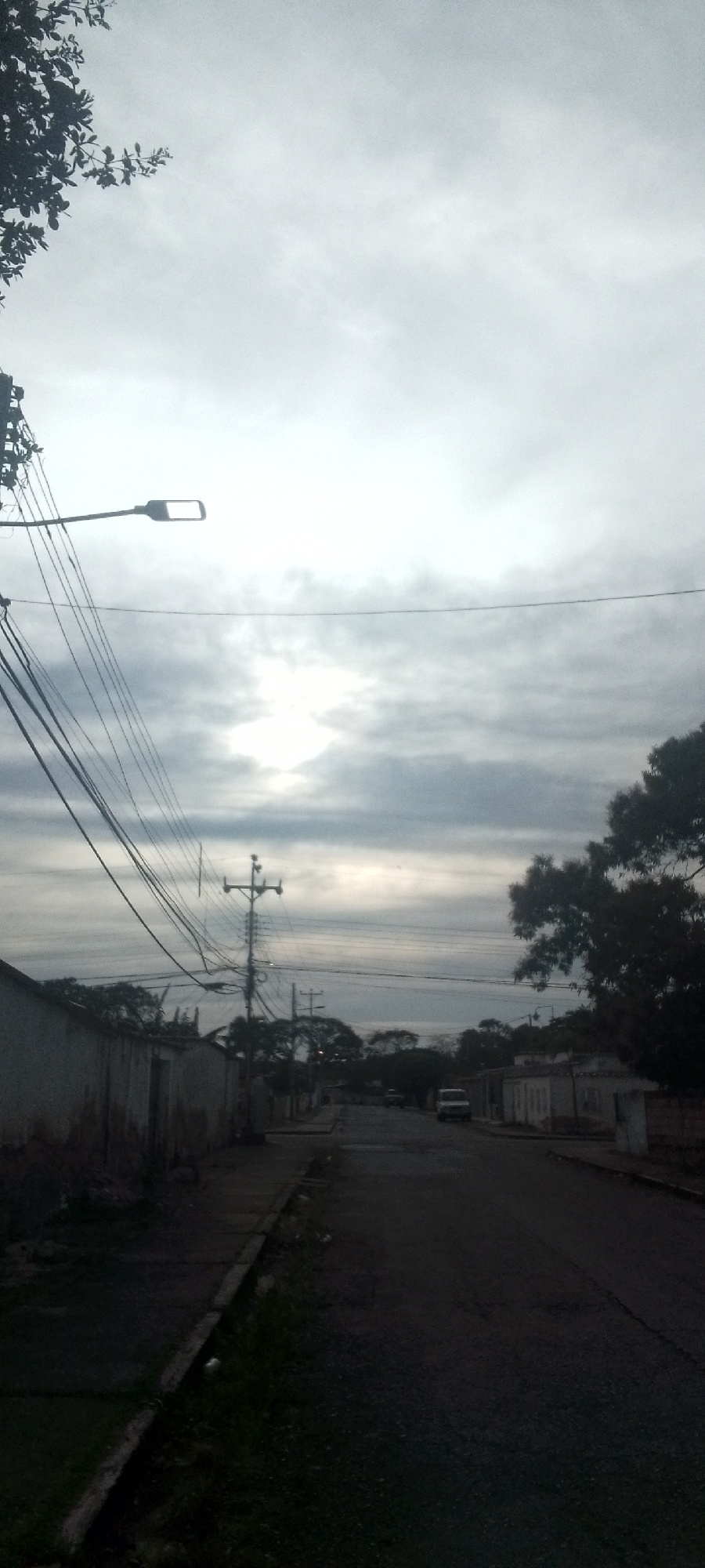 The image shows a street scene in Juan Griego, Venezuela under a cloudy sky. A paved road stretches into the distance, flanked by buildings and trees on either side. Several utility poles and power li…read more
