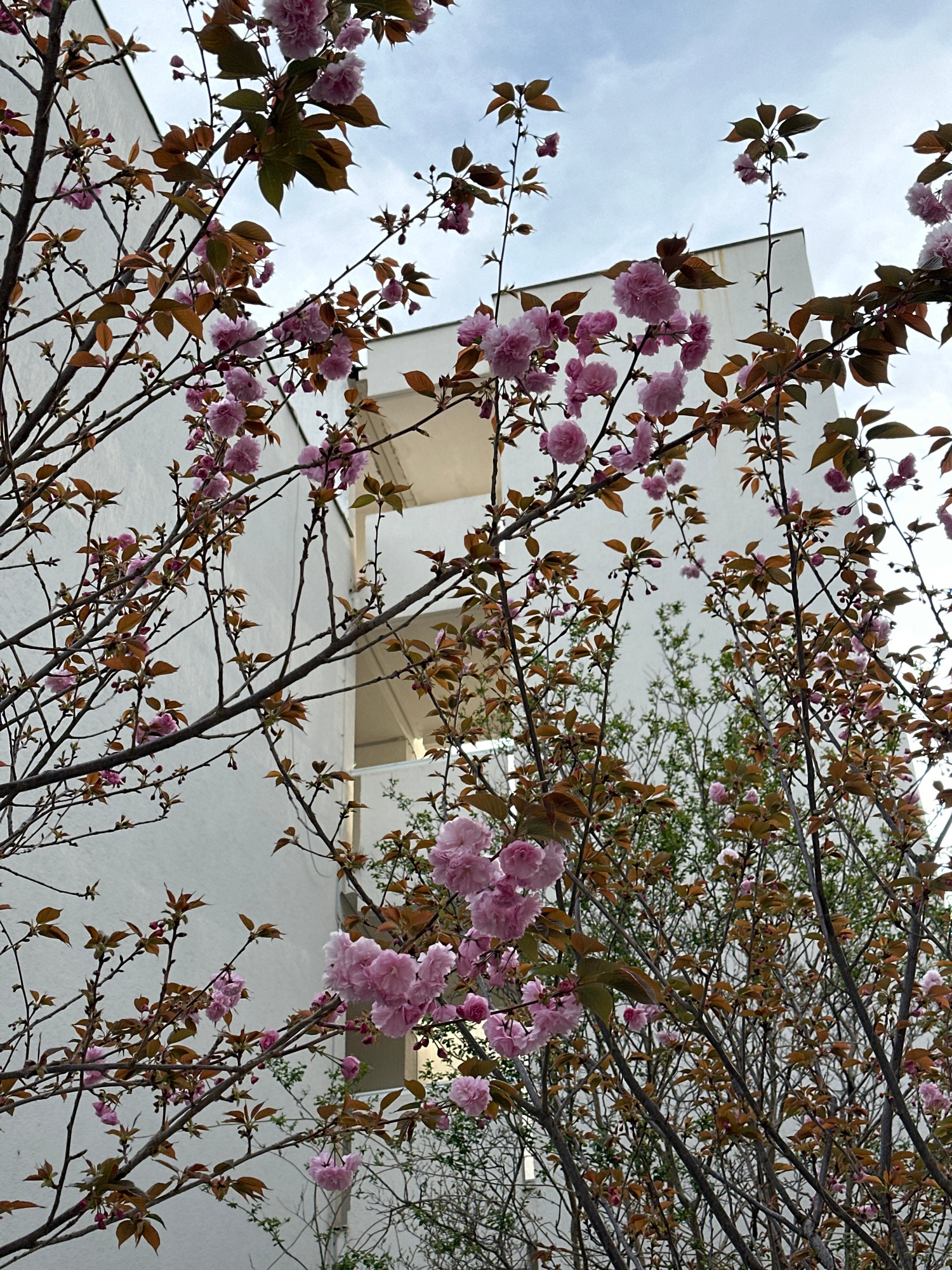 The image depicts a view looking up through tree branches with pink blossoms towards a white building under a cloudy sky. The location appears to be urban, with the building suggesting an apartment or…read more