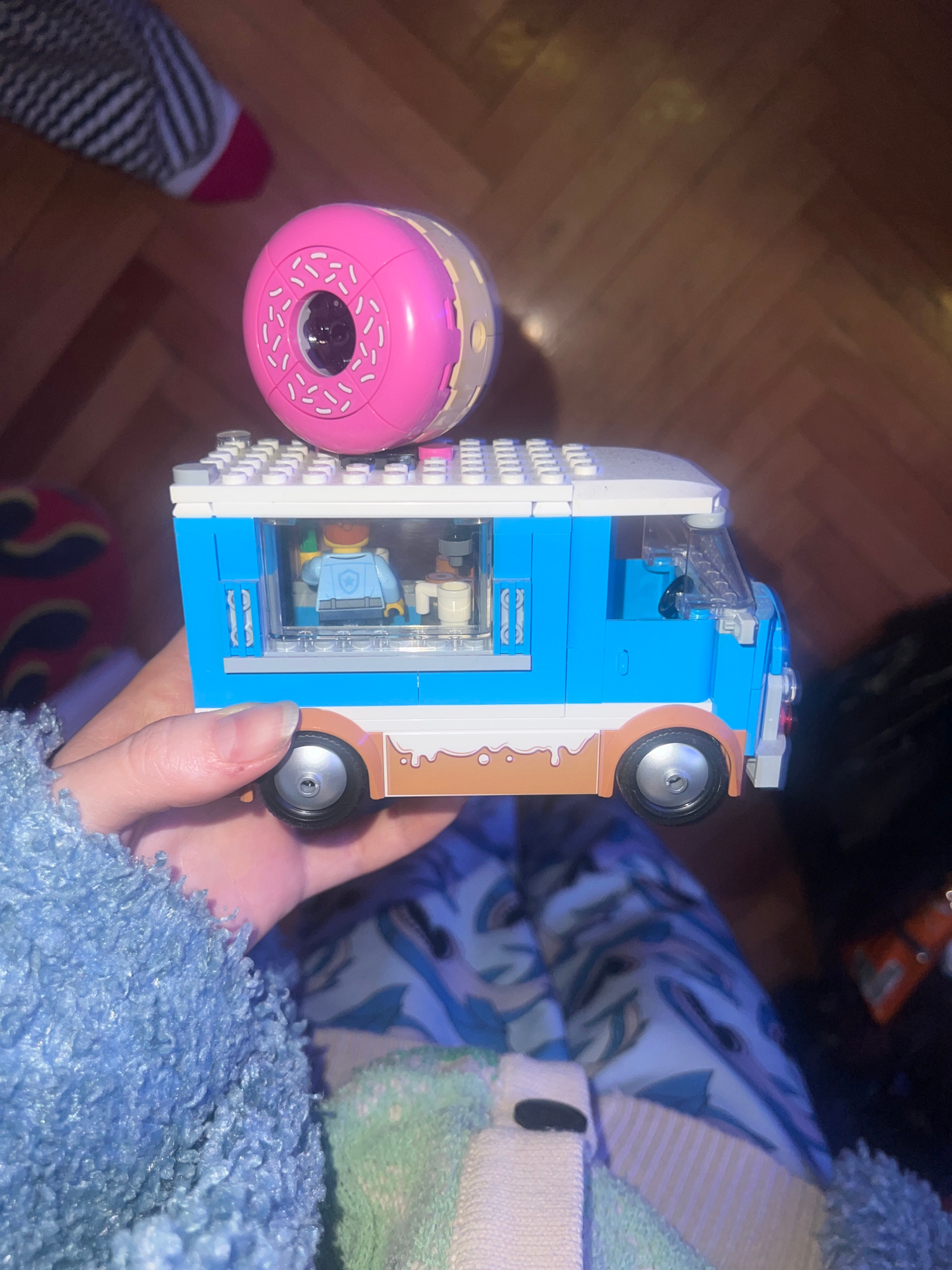 A person holds a Lego donut shop truck in their hand. The truck is blue and white with brown accents to mimic frosting, and a pink donut sign is attached to the side. The truck's window shows Lego minβ¦read more