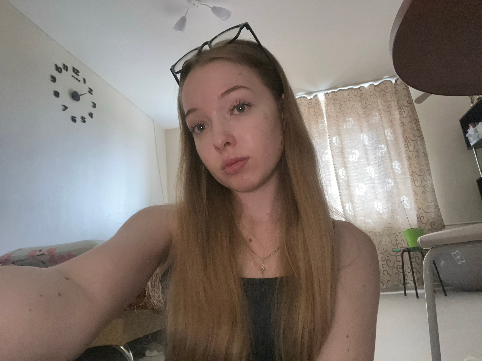 An indoor selfie captures a young woman looking directly up at the camera from an overhead perspective. She has long, straight, light brown hair that frames her face, falling around her shoulders. Herβ¦read more