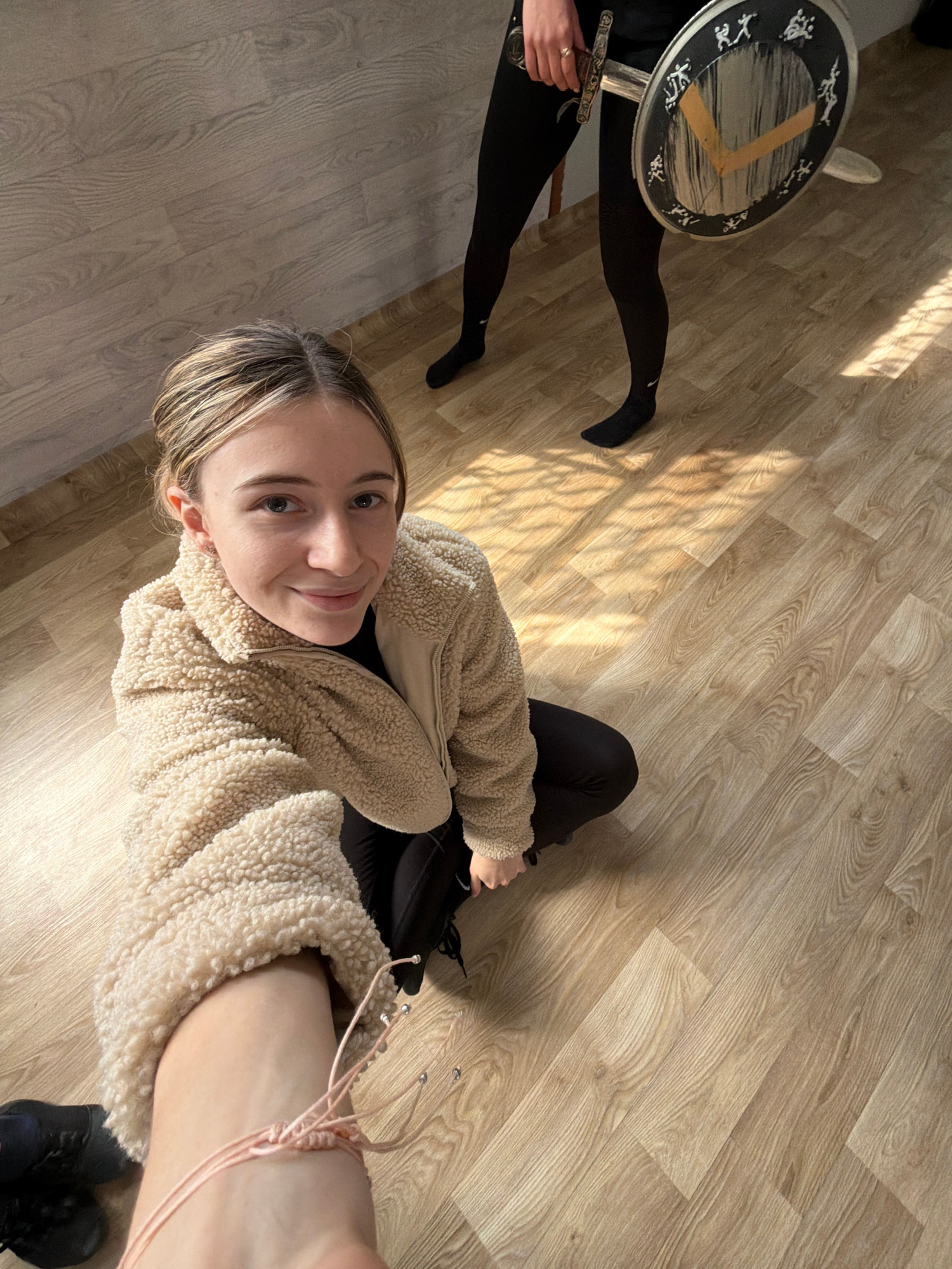 A medium-shot photograph depicts a woman taking a selfie from a top-down perspective, situated in a room with light-colored wood laminate flooring. The woman is wearing a beige sherpa jacket over a bl…read more