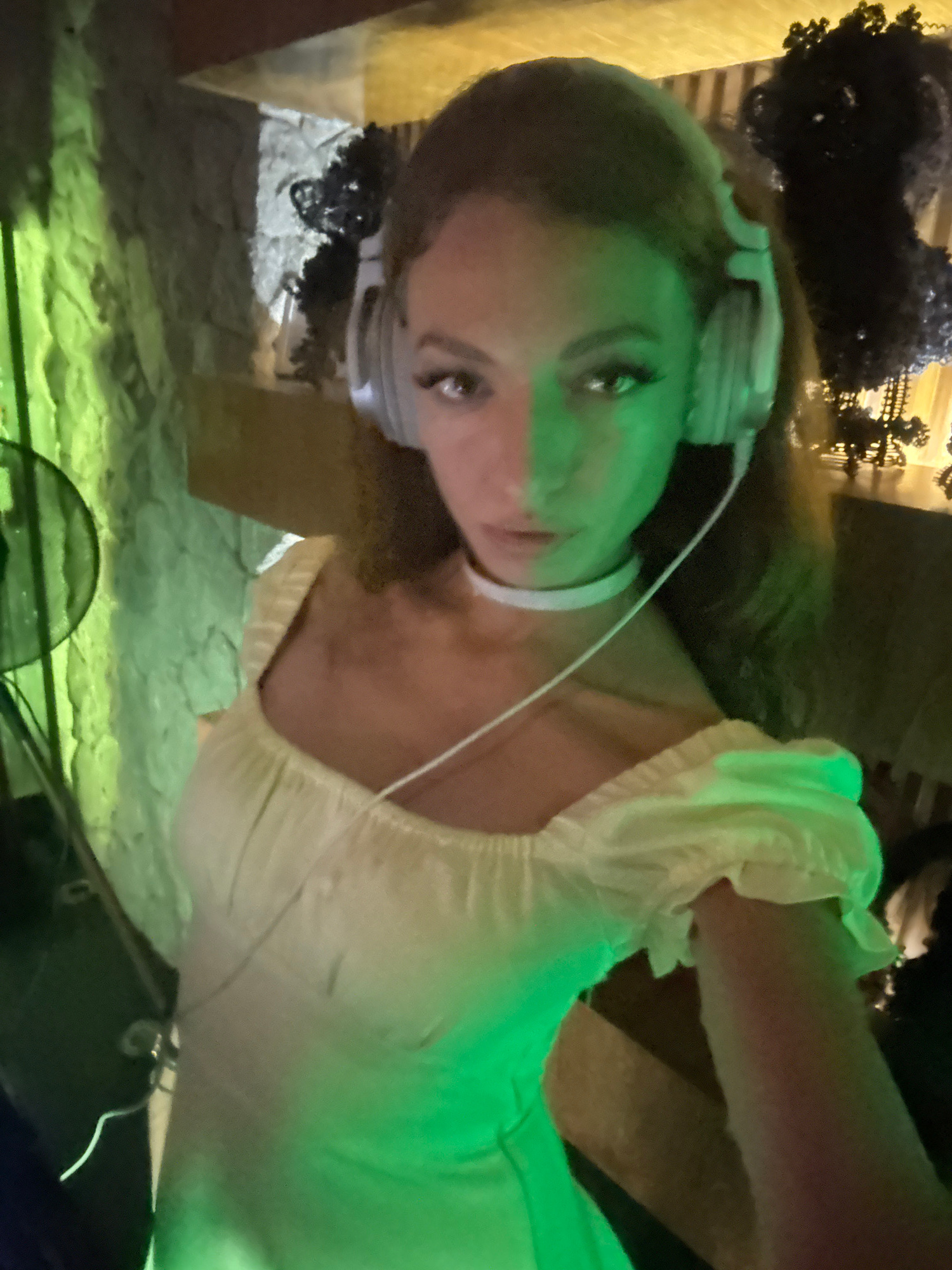 A woman with light brown hair wearing white headphones and a light-colored top is looking at the camera. The scene is lit with green light. The background appears to be a stone or textured wall. Based…read more