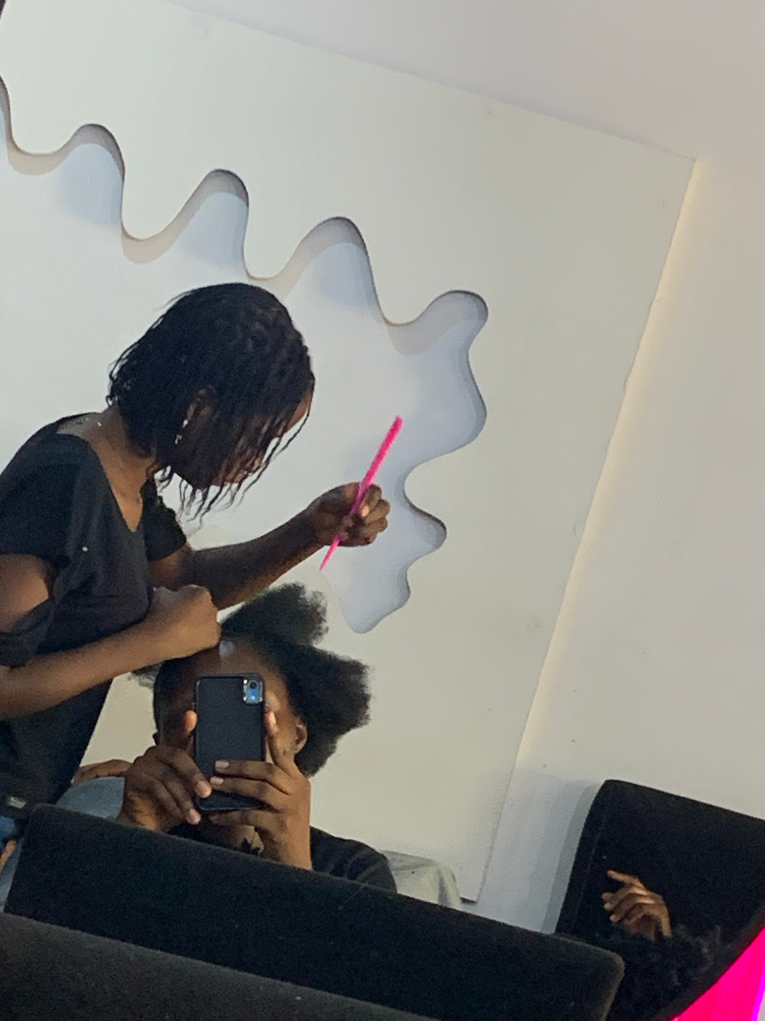The image depicts two individuals engaged in hairstyling. One person is holding a pink comb near another person's head, likely styling their hair. The second person is holding a smartphone, presumably…read more