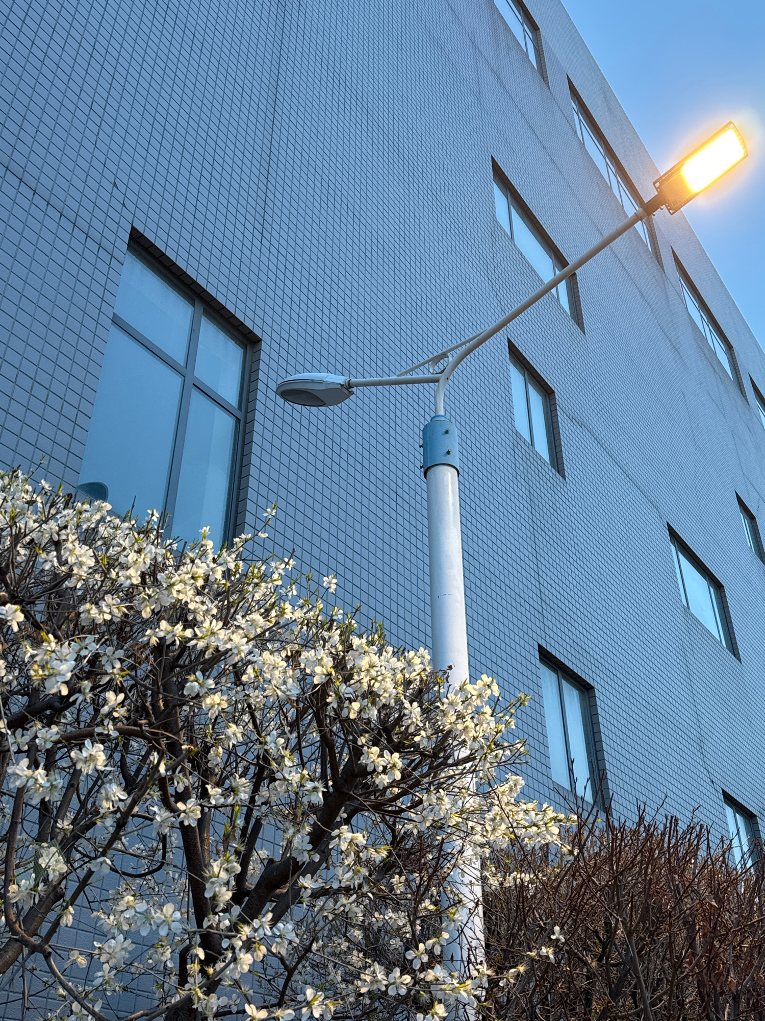 A low-angle shot features a building facade constructed with a grid of small, light-blue tiles. The building has rectangular windows with dark frames. A street lamp with a cylindrical pole extends fro…read more