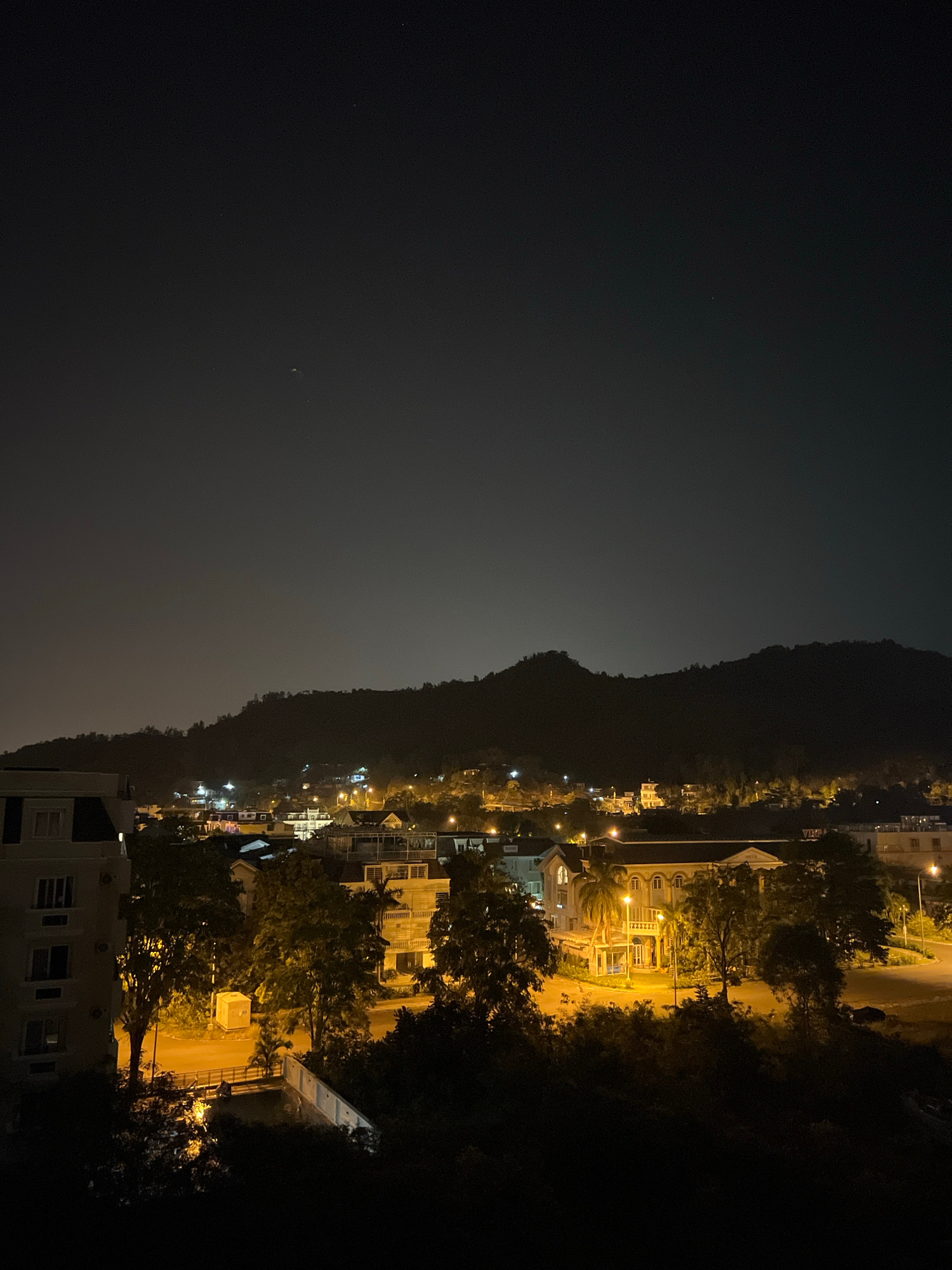 The image presents a nighttime view of Nam Nha Trang, Vietnam. A dark mountain range runs vertically on the right of the scene. To the right of the mountains is an illuminated area showing the city wi…read more