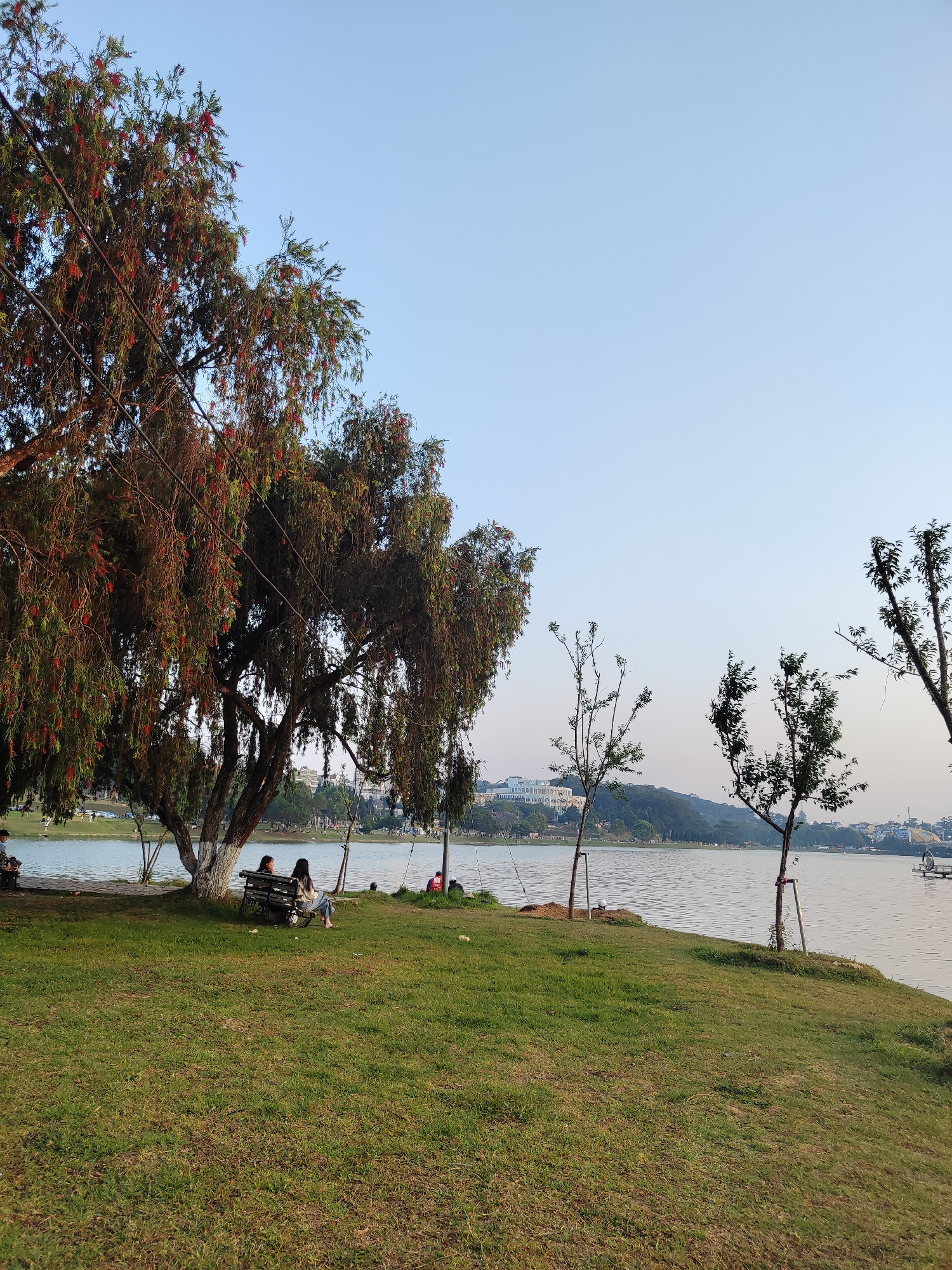 The scene depicts a park in Da Lat, Vietnam, on what appears to be an overcast day. A body of water is present, with a distant building or complex visible on the opposite shore. In the foreground, a g…read more
