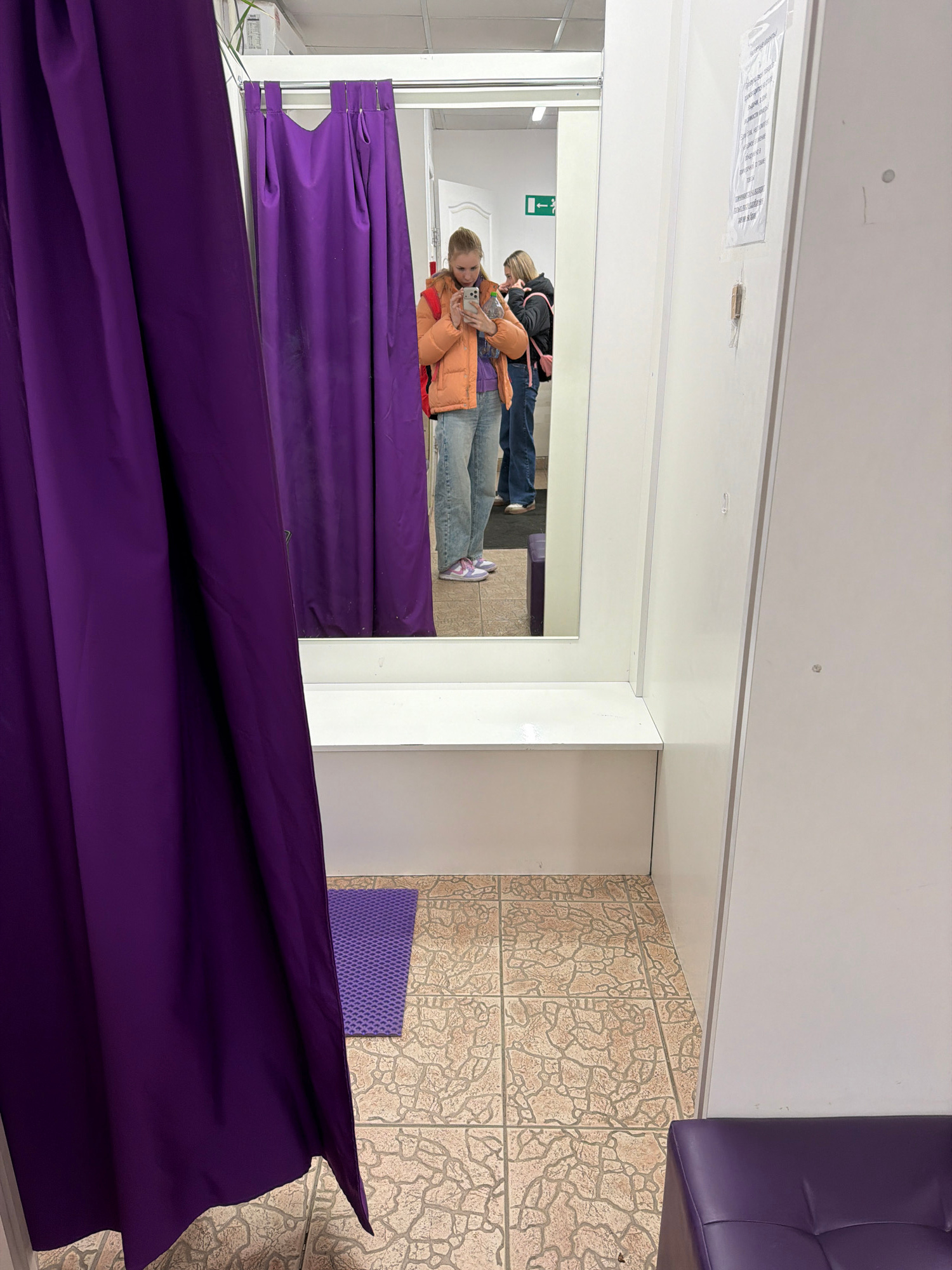 The image depicts a changing room with a mirror reflecting two individuals. One person in the mirror is holding a smartphone, possibly taking a photo. They are wearing a vibrant orange jacket. The oth…read more