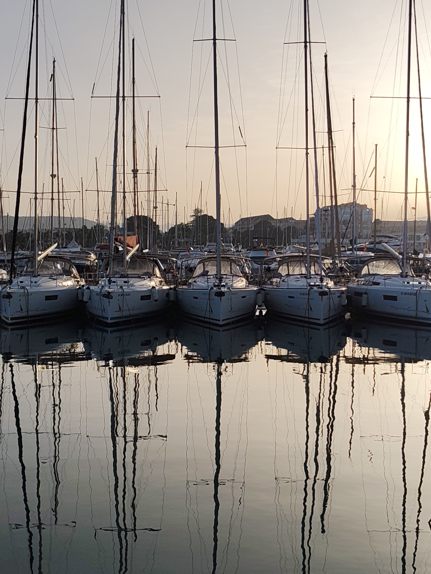 The image depicts a row of sailboats moored in the harbor of Dénia, Spain. Five white sailboats are prominently featured in the foreground, their hulls reflecting in the calm water. The masts of the s…read more