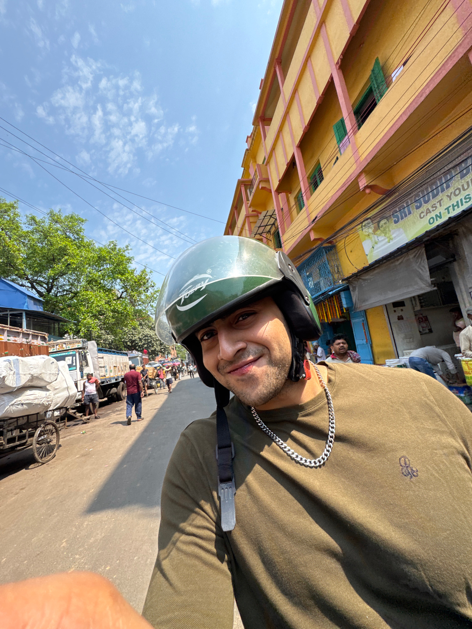 A young adult male, centrally positioned in a close-up selfie, wears a light green full-face motorcycle helmet with "Topper" branding and a dark olive-green long-sleeved shirt with a small, dark embro…read more