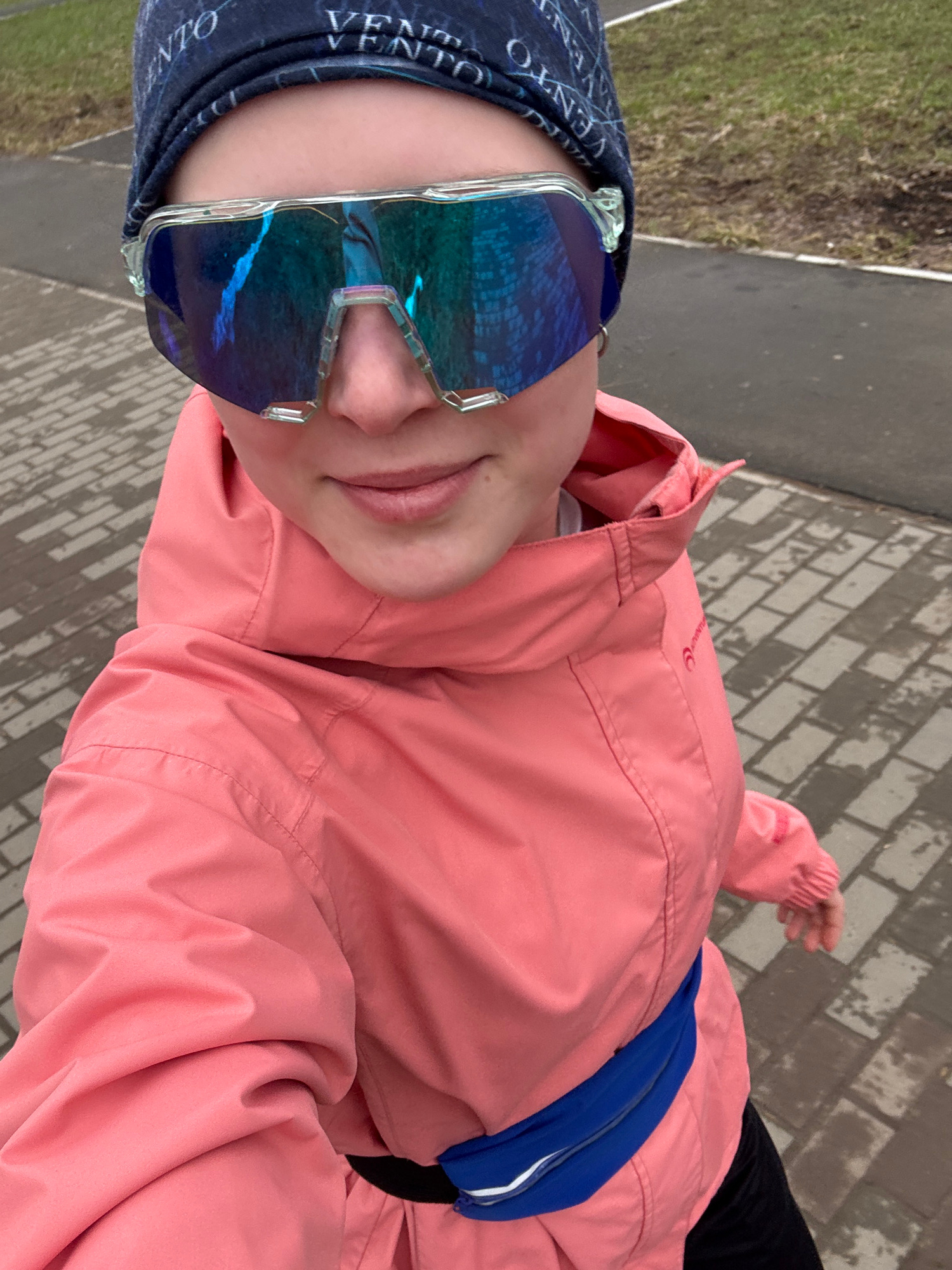 A person wearing a pink jacket, a blue headband with text, and reflective blue sunglasses is posing outdoors. The person is also wearing a blue fanny pack. The background appears to be a paved area wi…read more