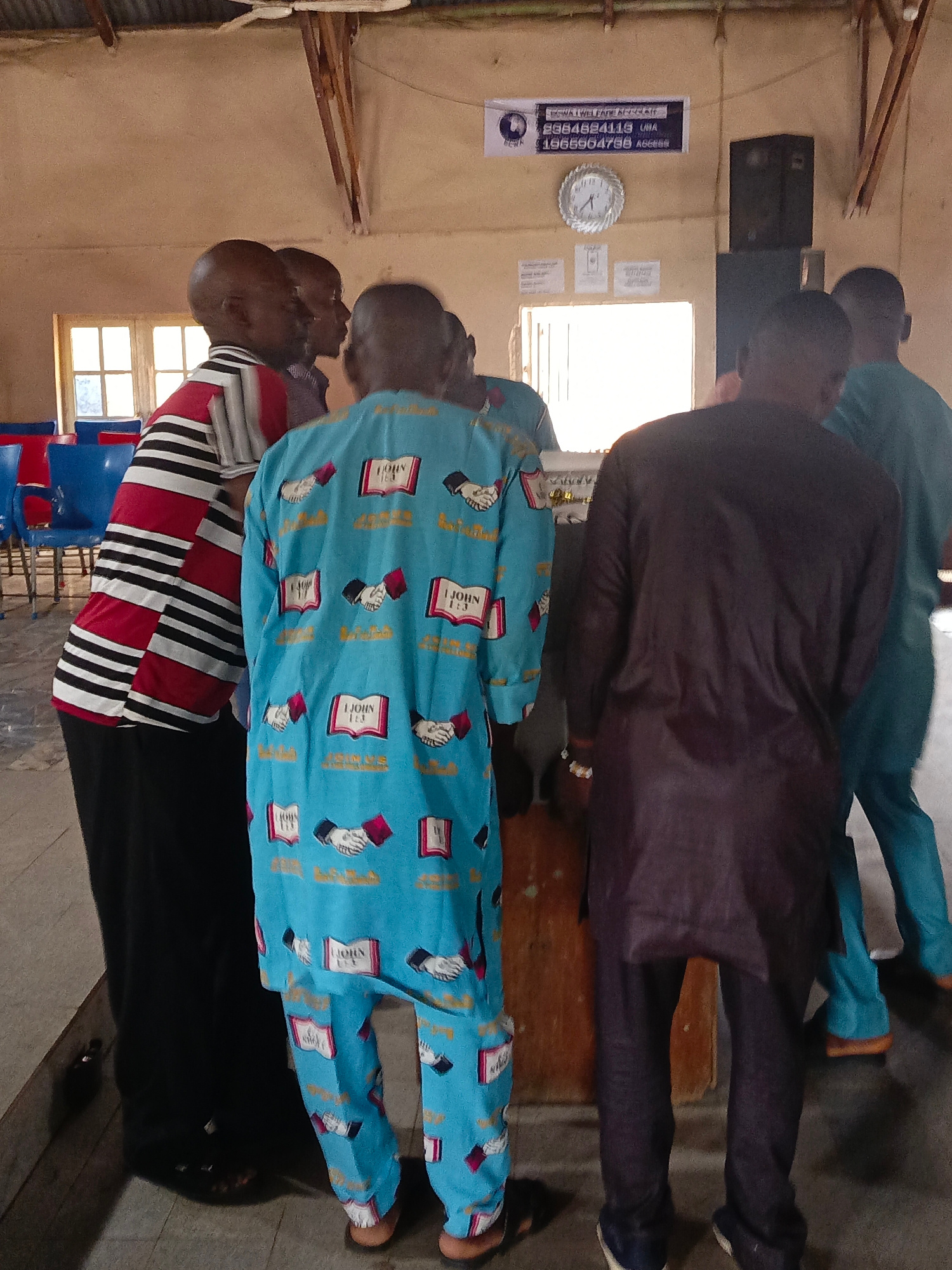 The image shows a group of men standing in an indoor space in Akwanga, Nigeria. A man on the left wears a striped shirt and black pants. Another man, centered in the frame, is wearing a blue outfit pa…read more