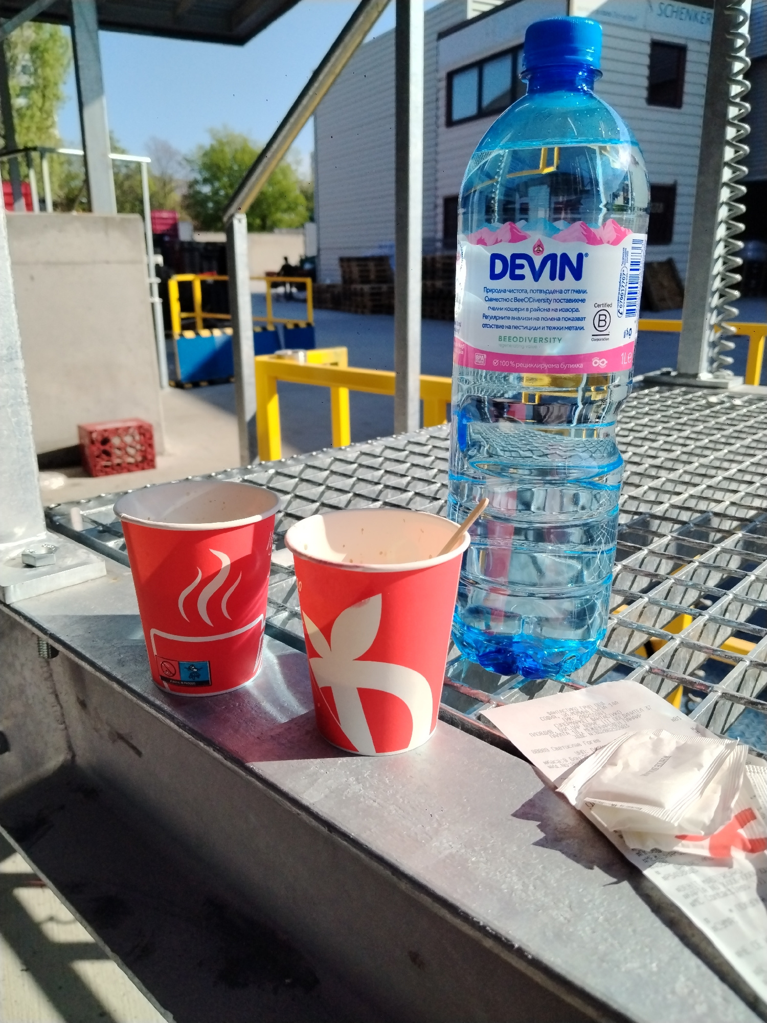The image shows two red paper coffee cups, a bottle of Devin water, a receipt, and sugar packets on a metal grate surface. The receipt includes the name "ОБЕДИНИТЕЛ," an address on "БУЛ. ЦАР БОРИС III…read more