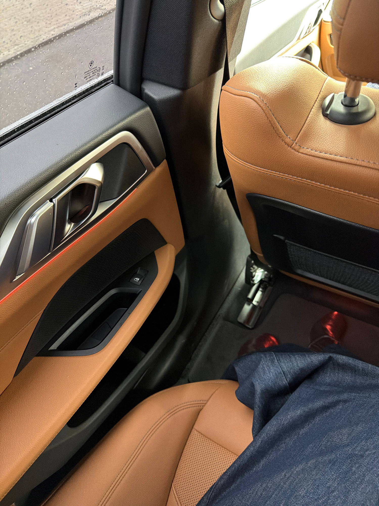 The image depicts the interior of a modern BMW vehicle, specifically focusing on the rear passenger compartment, observed from a forward-facing perspective. A person is seated in the rear, evidenced b…read more