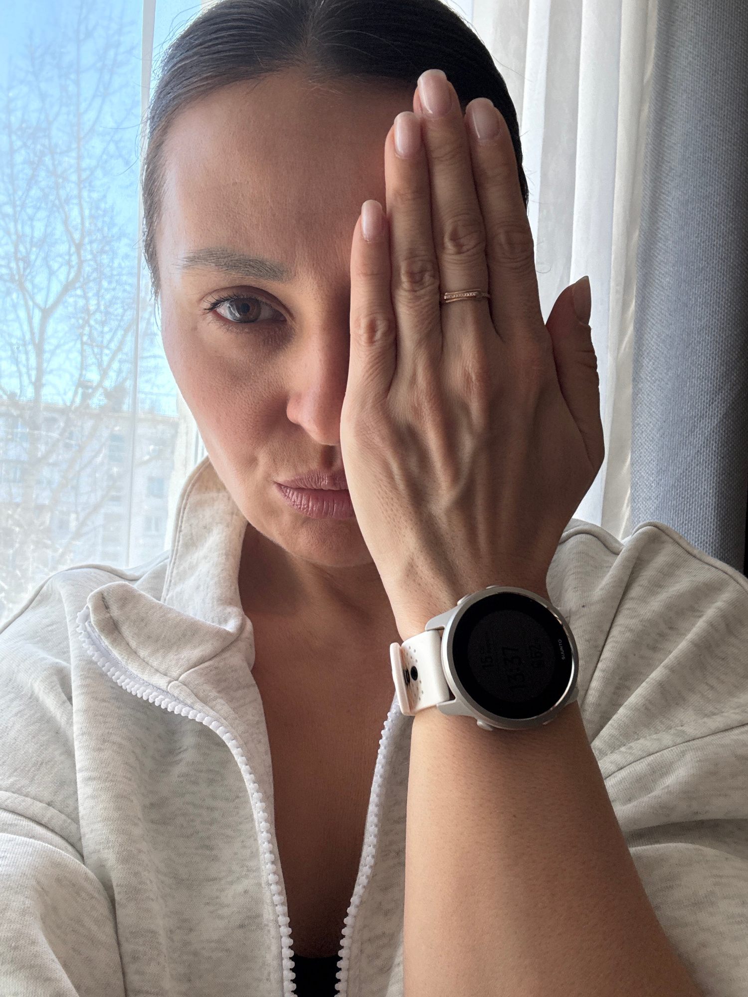 A person is indoors in what appears to be Chaikovsky, Russia, given the window view of a leafless tree suggesting a colder climate and the context of the request. The person is wearing a light-colored…read more