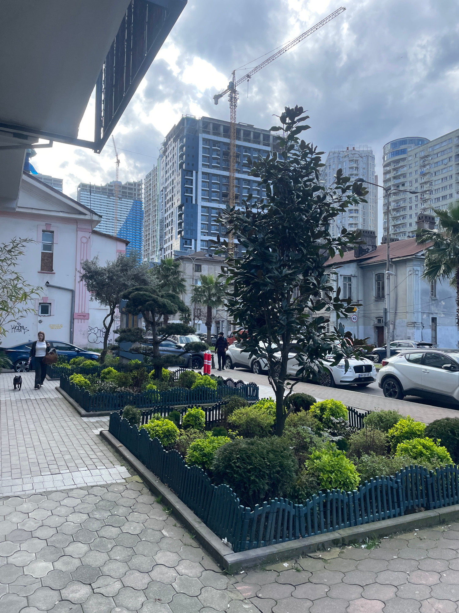 The image shows a street scene in Batumi, Georgia. A sidewalk paved with grey hexagonal tiles runs along the right side of the frame. A low, dark green fence separates the sidewalk from a narrow stripβ¦read more