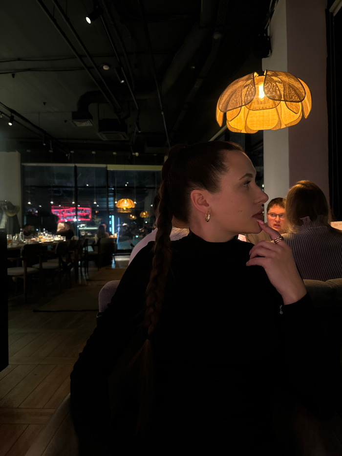 A woman with long, braided hair sits at a restaurant. She has her finger to her lips, lost in thought. A blurred figure sits to her right, and lights shine in the background. A lamp hangs in the foreg…read more