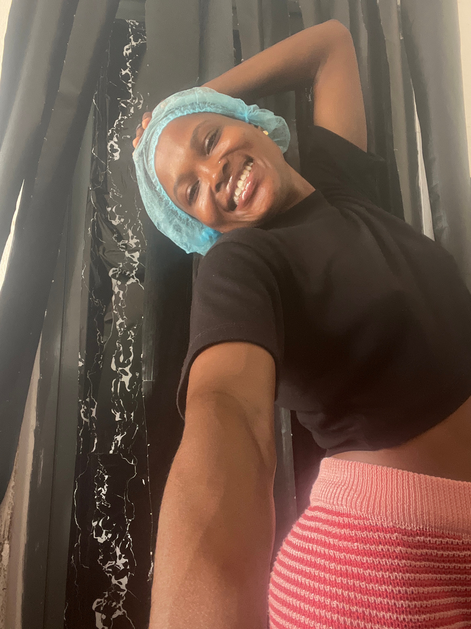 A smiling woman wearing a blue surgical cap and a black top is pictured in what appears to be an indoor setting. The background features black and white marble-like patterned surfaces, suggesting poss…read more