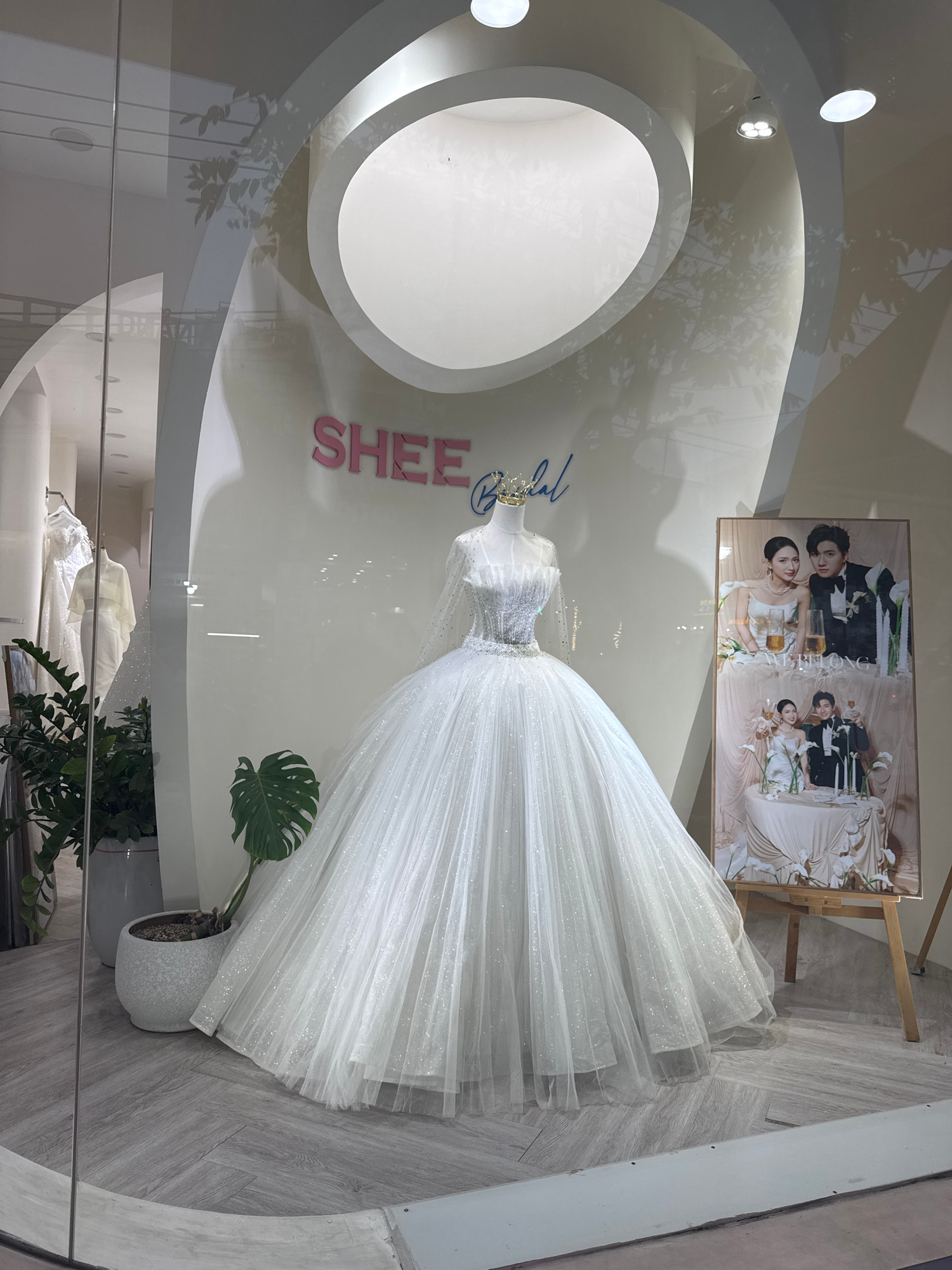 This appears to be a photograph of a wedding dress displayed in a shop window. The dress is a white, layered gown, possibly made of tulle or a similar fabric. It is displayed on a mannequin. Behind th…read more