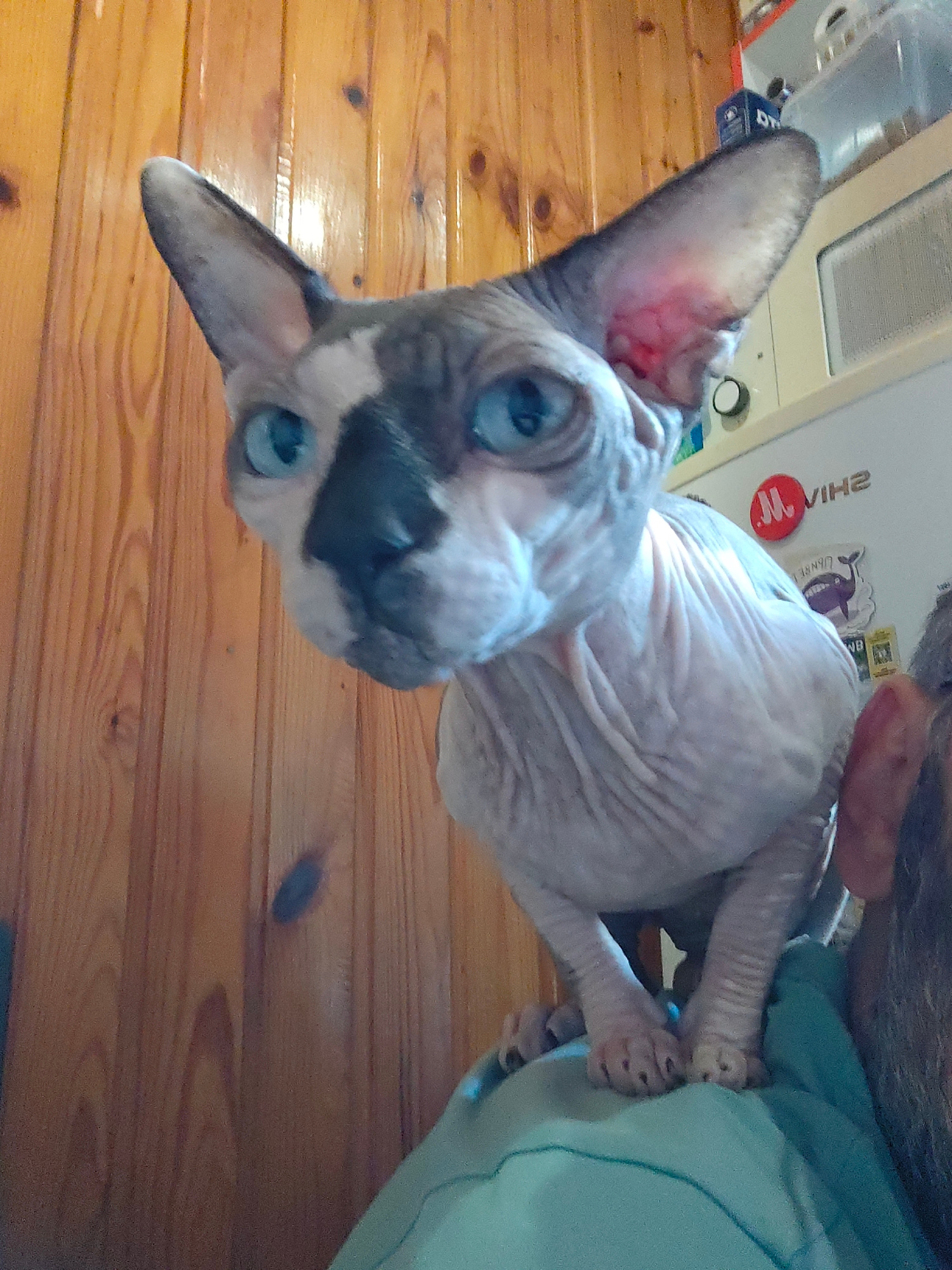 A Sphynx cat with blue eyes and a black and grey mottled face sits on a person's shoulder. The cat's body appears hairless and wrinkled. In the background is a wooden wall, a white refrigerator with s…read more