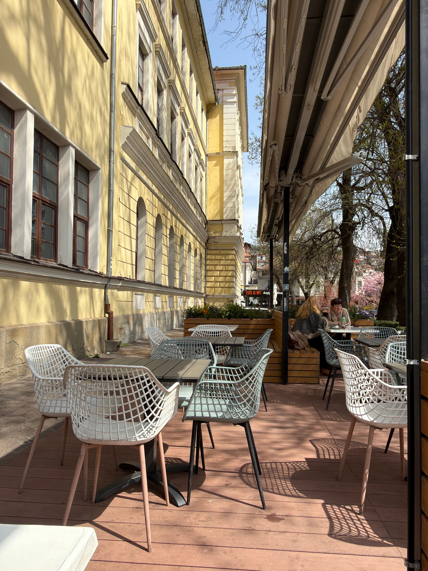 The image shows an outdoor seating area of a restaurant in Veliko Tarnovo, Bulgaria. Tables and chairs are placed on a wooden deck under a retractable awning. Two women are seated at one of the tablesβ¦read more
