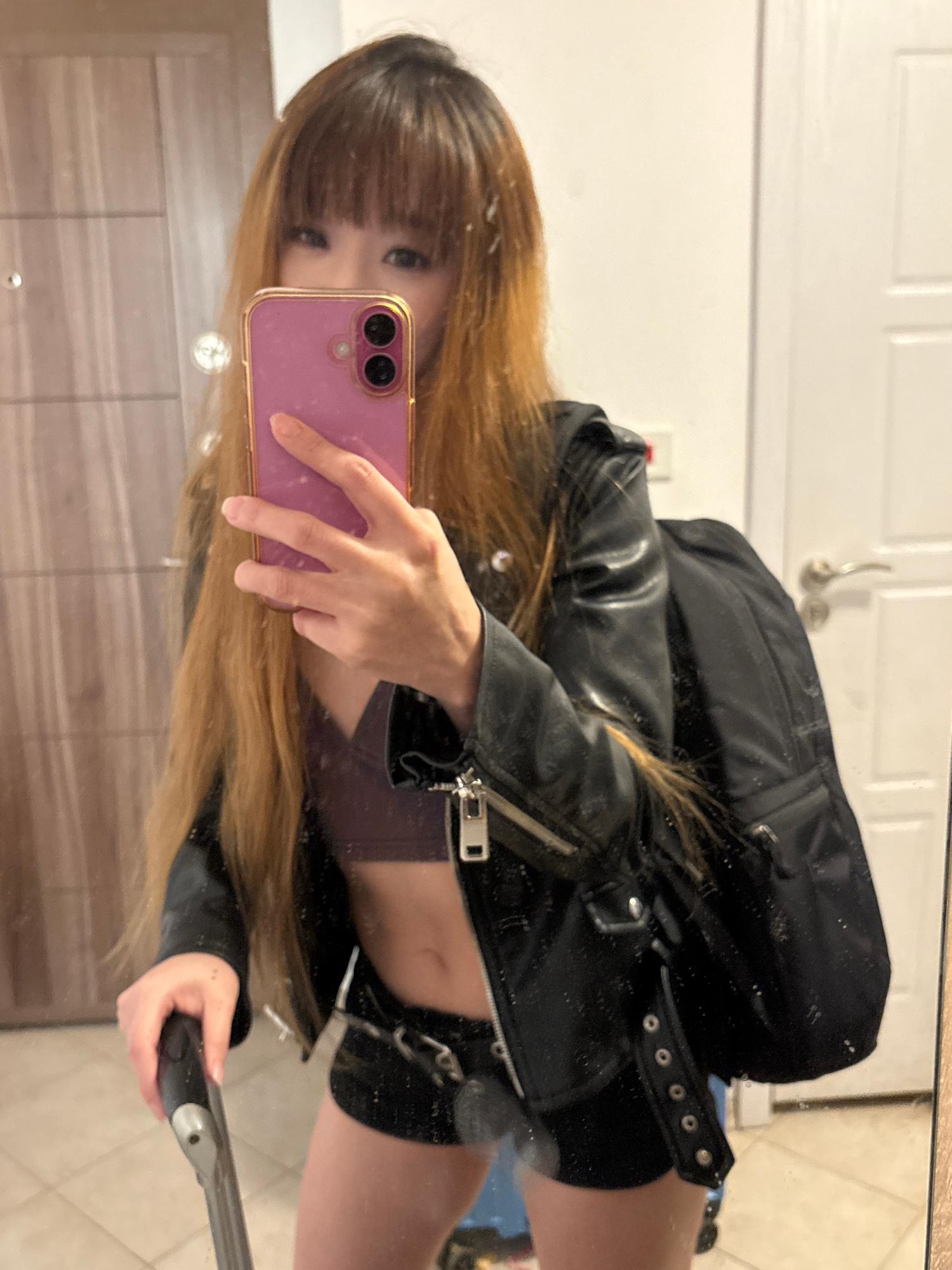 A woman is taking a mirror selfie. She is wearing a black leather jacket and skirt, and has long brown hair. She is holding a purple phone in her hand. It is difficult to determine the exact location…read more