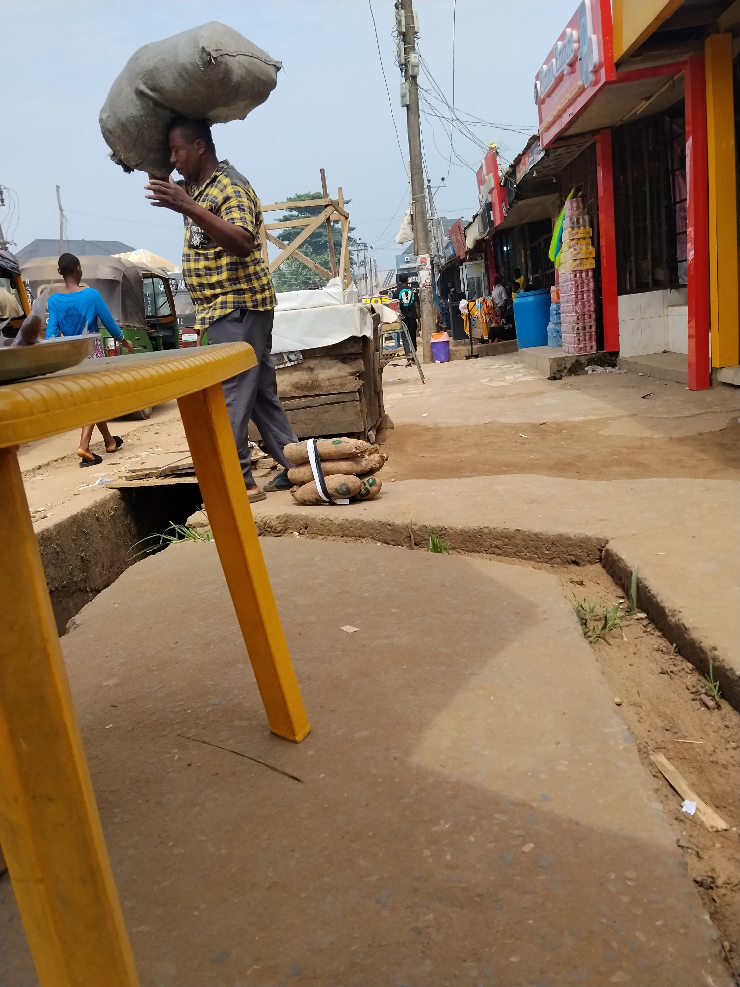 The image depicts a street scene in Umuode, Nigeria. A man is carrying a large sack on his head while walking on the sidewalk. He is wearing a yellow and black checkered shirt and gray pants. Next to…read more