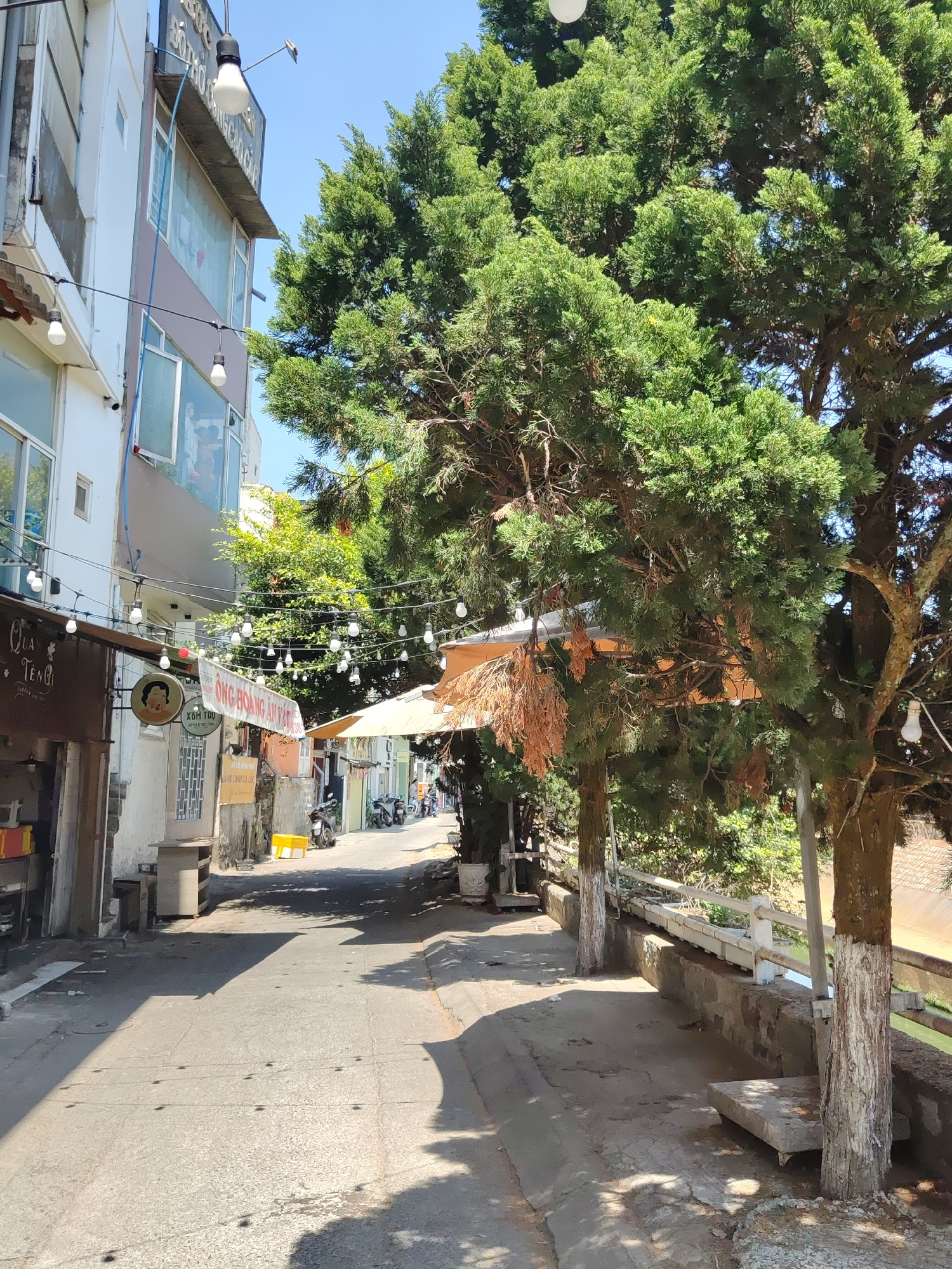 The image captures a narrow street scene in Da Lat, Vietnam. The street is lined with buildings on the left and trees on the right. Overhead, strings of light bulbs stretch across the street, creating…read more