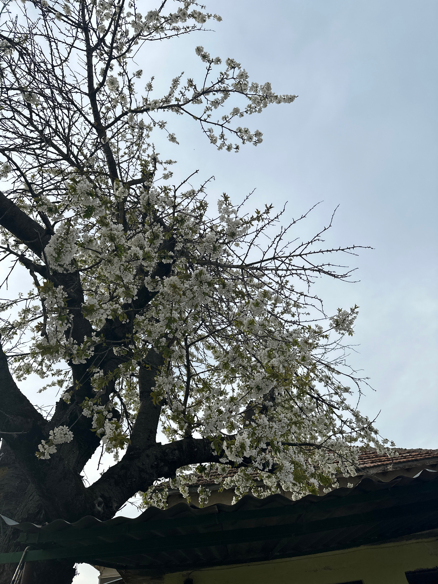 A low-angle shot depicts a tree with white blossoms against a pale, overcast sky. Some branches are bare, while others are laden with flowers. To the right of the tree, a building's corrugated metal r…read more