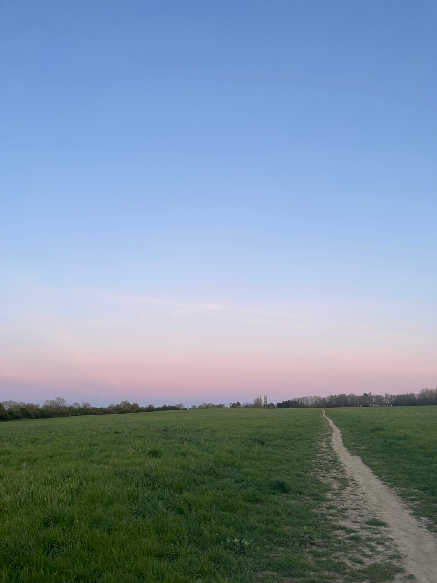 The image shows a landscape likely captured in Maidstone, United Kingdom, given the environment. The sky transitions from blue to pink at the horizon. Adjacent to the sky is a green field with a lightβ¦read more
