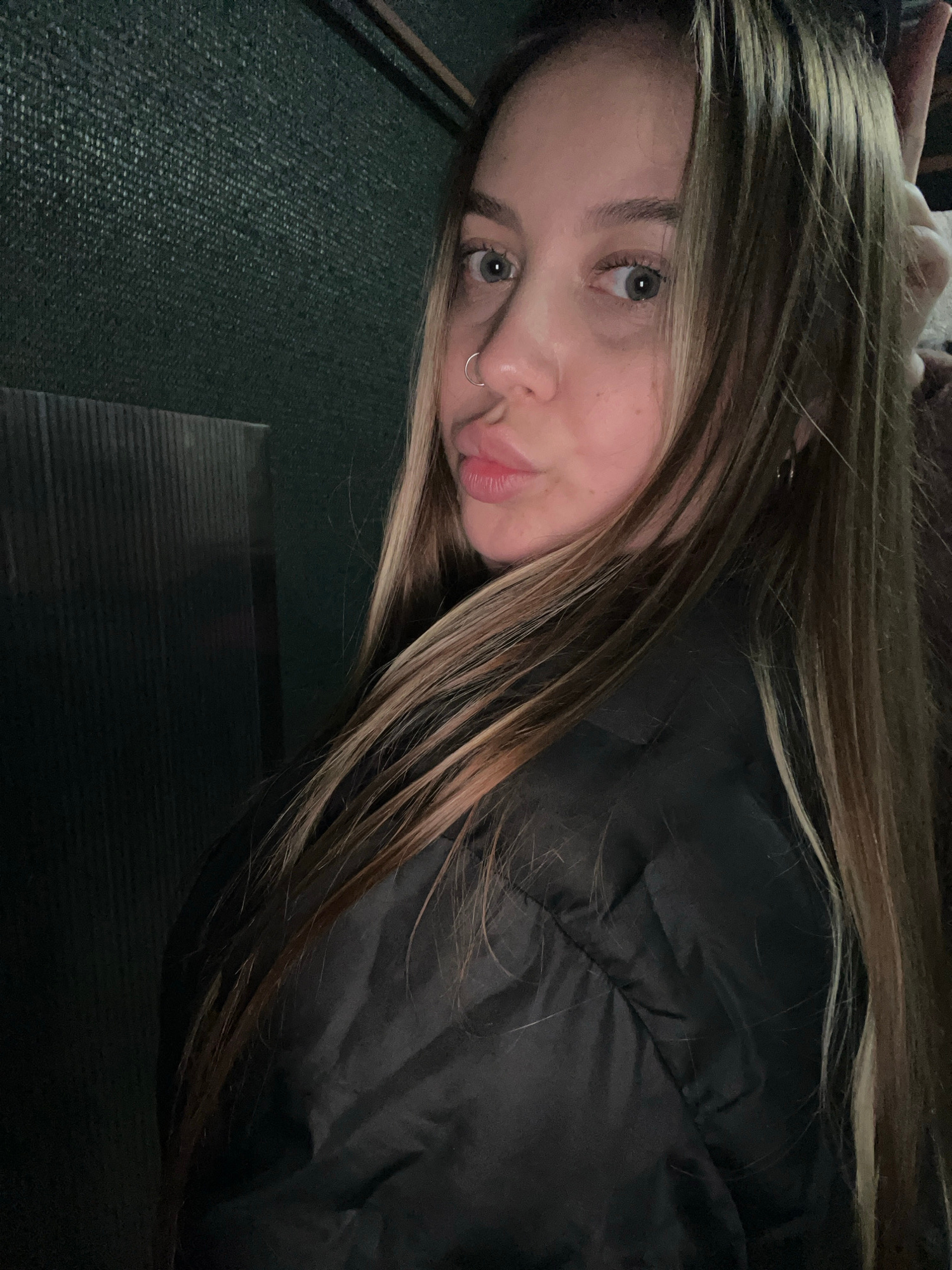 A woman with long brown hair is lying down, wearing a black puffer jacket. She has a nose ring and light eyes. The background is a dark, possibly green, textured surface. The image appears to be taken…read more