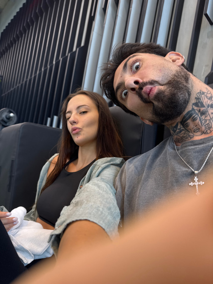The image depicts two individuals, a male and a female, captured in a selfie within a modern fitness center in Bangkok, Thailand. The male, foregrounded on the right, has dark hair, a beard, and exten…read more