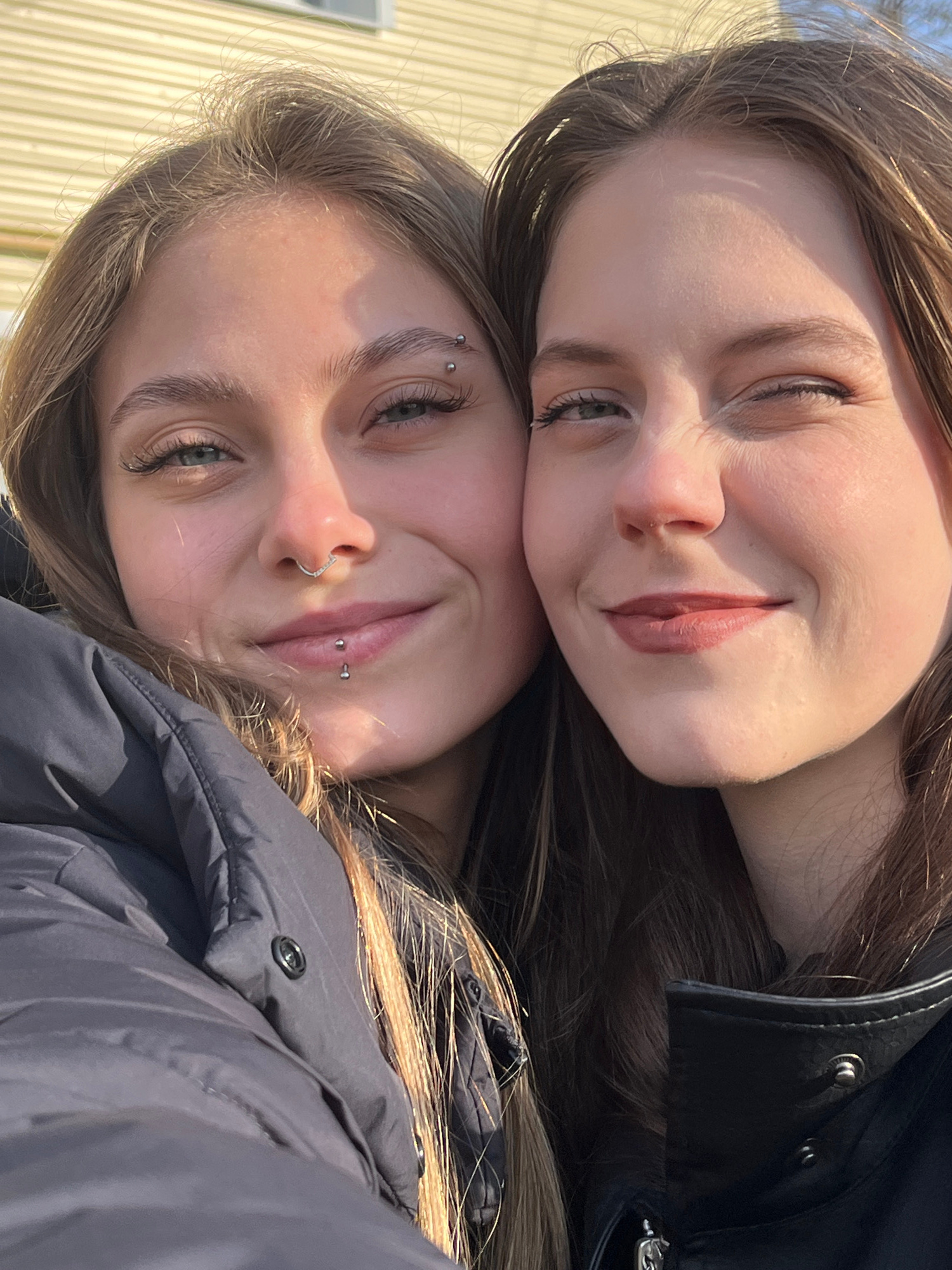 Two young women are captured in a close-up selfie, embracing a casual and friendly pose in an outdoor setting in Фоки, Russia. The image is rotated, with their heads angled to the bottom left. The wo…read more