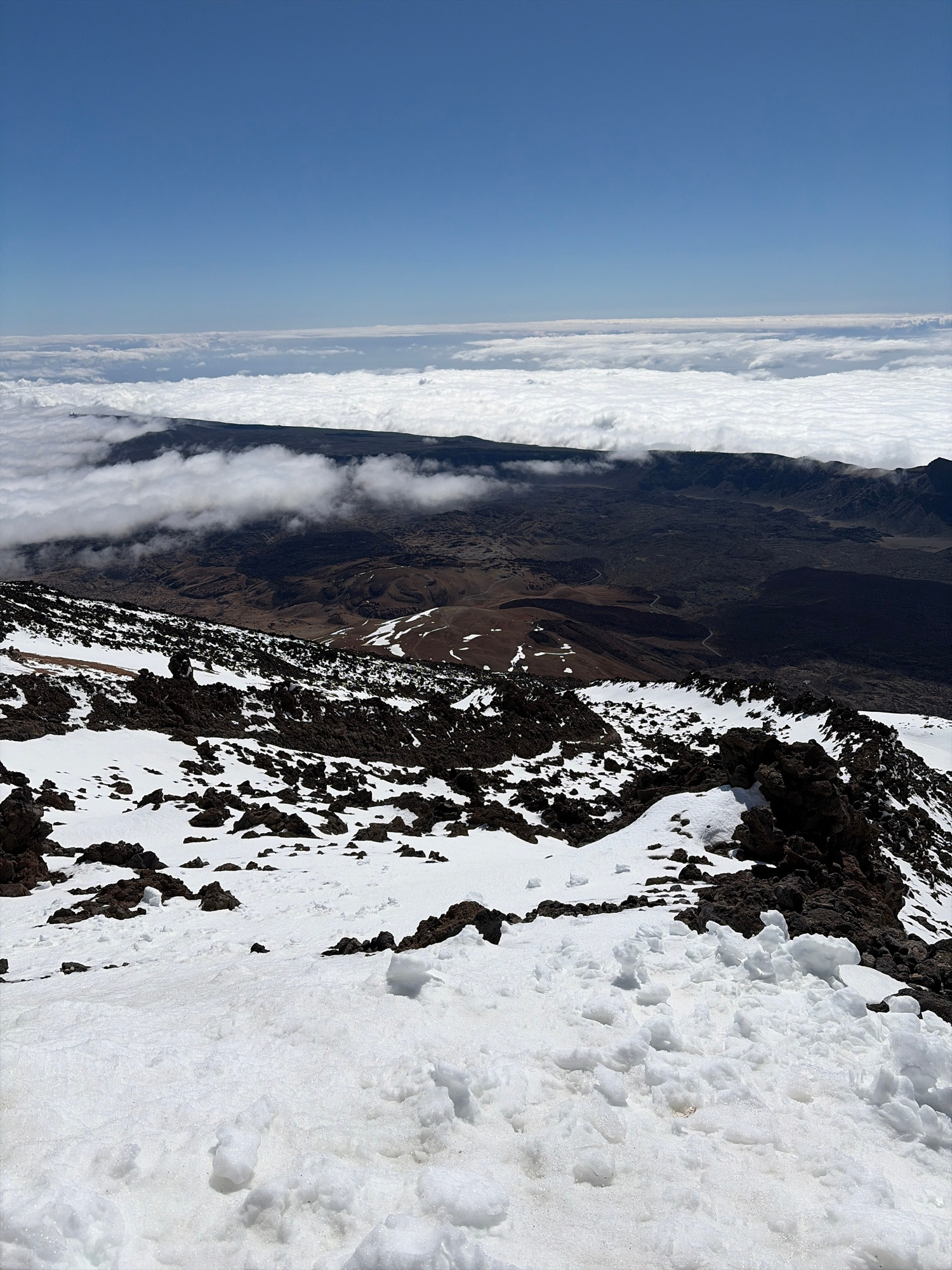 The image shows a view from Teide, a volcano on Tenerife, Spain, likely in the municipality of La Orotava. The foreground is composed of black volcanic rock and patches of snow. A large valley lies be…read more