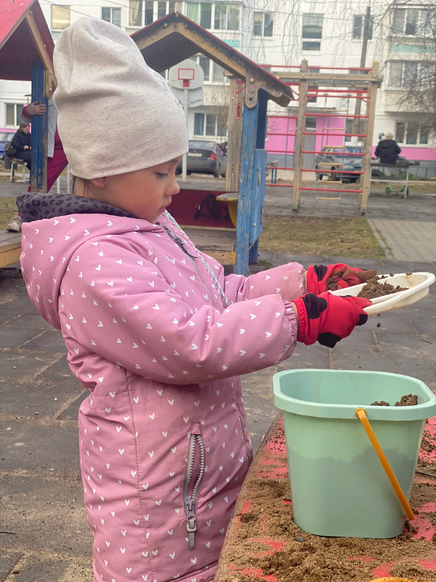 A child is playing with sand at a playground in Chaikovsky, Russia. The child, wearing a pink winter coat with white hearts, red gloves, and a light-colored hat, is holding a white plastic dish filled…read more