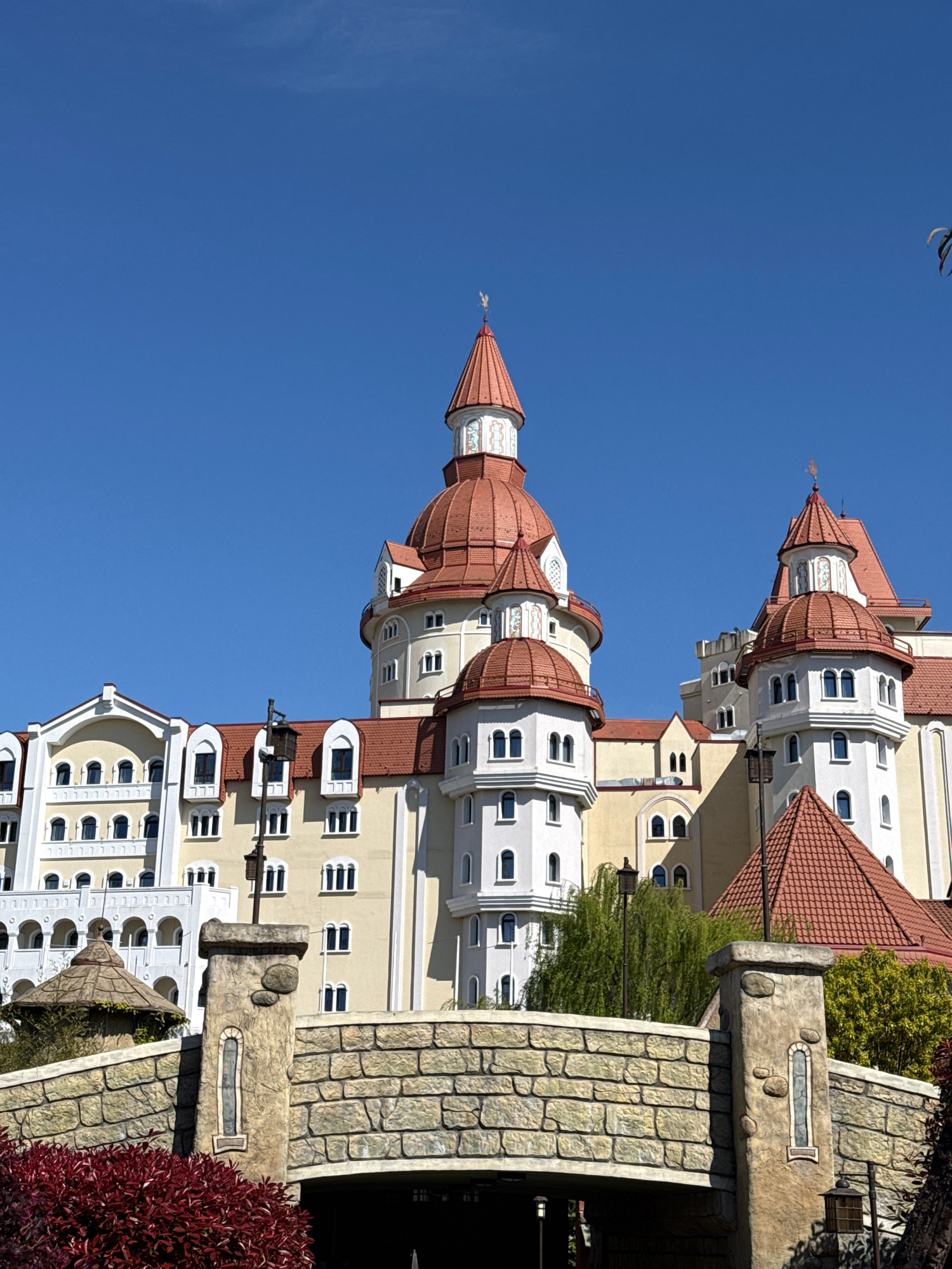 The image presents a grand and ornate building, possibly a hotel or resort, featuring a distinctive architectural style reminiscent of a fairytale castle, set against a vibrant clear blue sky. The mul…read more