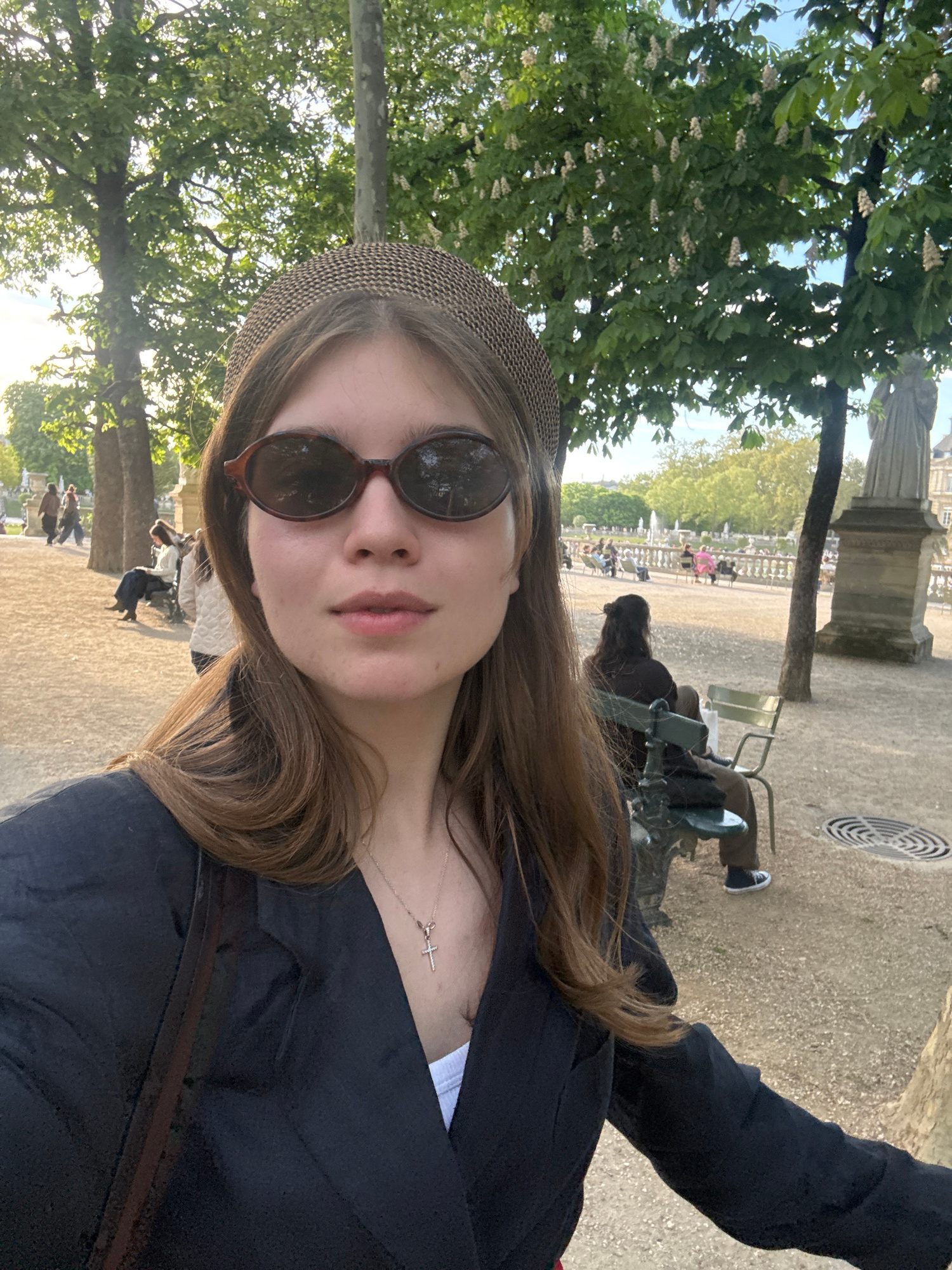 A selfie shows a woman wearing a hat and sunglasses, with a crucifix necklace visible. In the background is the Jardin du Luxembourg, a park in Paris, France. People are seen sitting on park chairs, a…read more