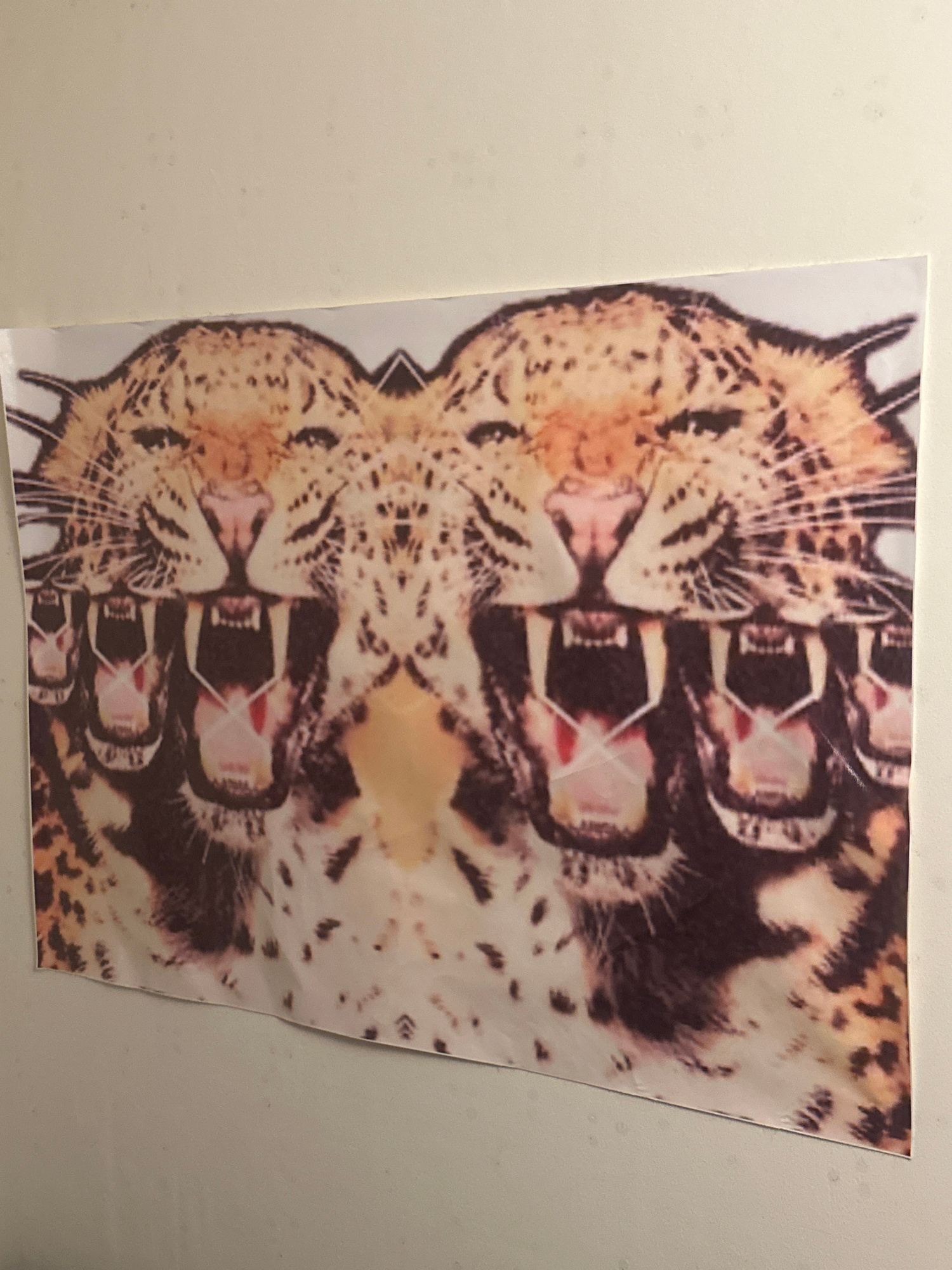 The image shows a printed poster of a leopard with its mouth open, seemingly roaring. The image is vertically oriented, with the leopard repeated twice, once right-side up and once upside down, effect…read more