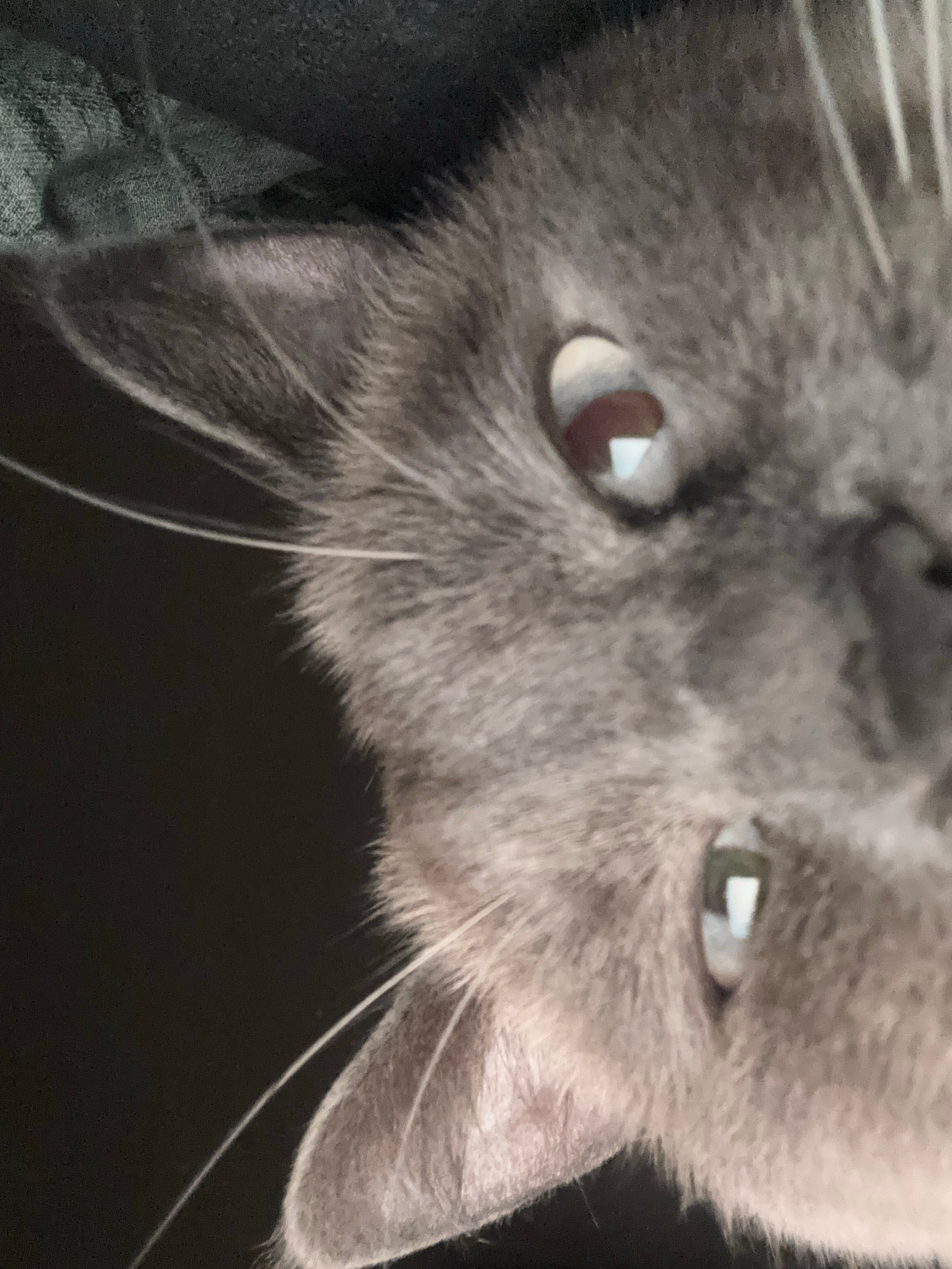The image is a close-up of a gray cat's face, turned upside down. The cat's eyes are visible, one appears brown and the other green. The cat's whiskers are long and white. The background is dark. Ther…read more