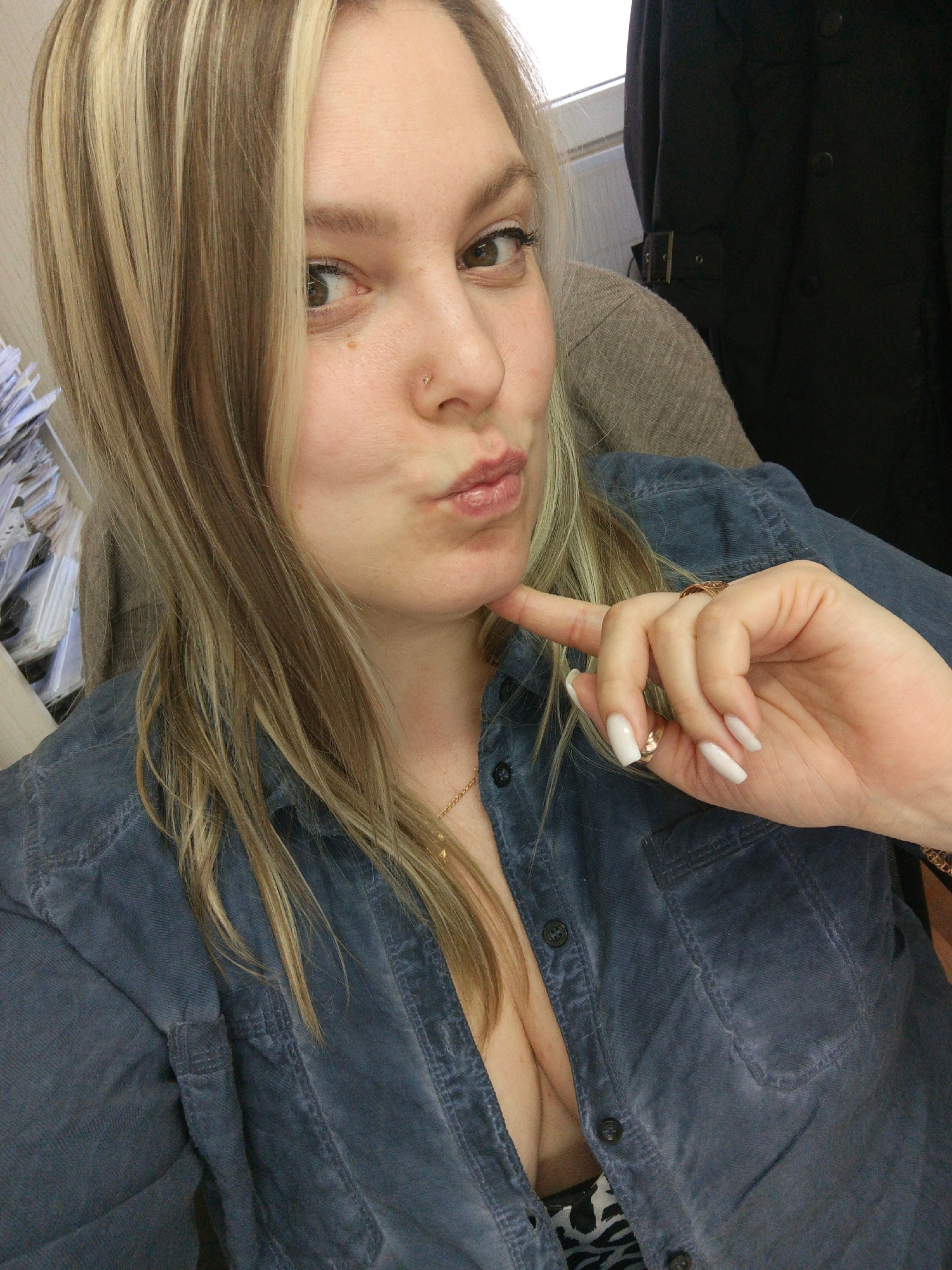 A blonde woman with highlighted hair poses for a selfie indoors. She is wearing a blue button-down shirt and jewelry. Her nails are long and white. She is making a pouting face and touching her chin w…read more
