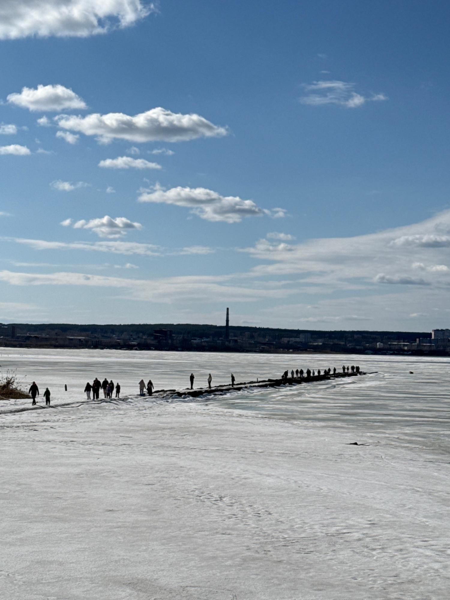 The image depicts a frozen body of water, possibly a lake or river, adjacent to a city skyline. A line of structures or possibly a pier extends into the water from the shoreline. A large number of peo…read more
