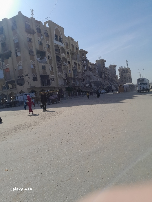 The image depicts a devastated urban street scene in Khan Yunis, Palestinian Territory, under a clear, bright blue sky. A wide, unpaved or heavily damaged road occupies the foreground and midground. T…read more