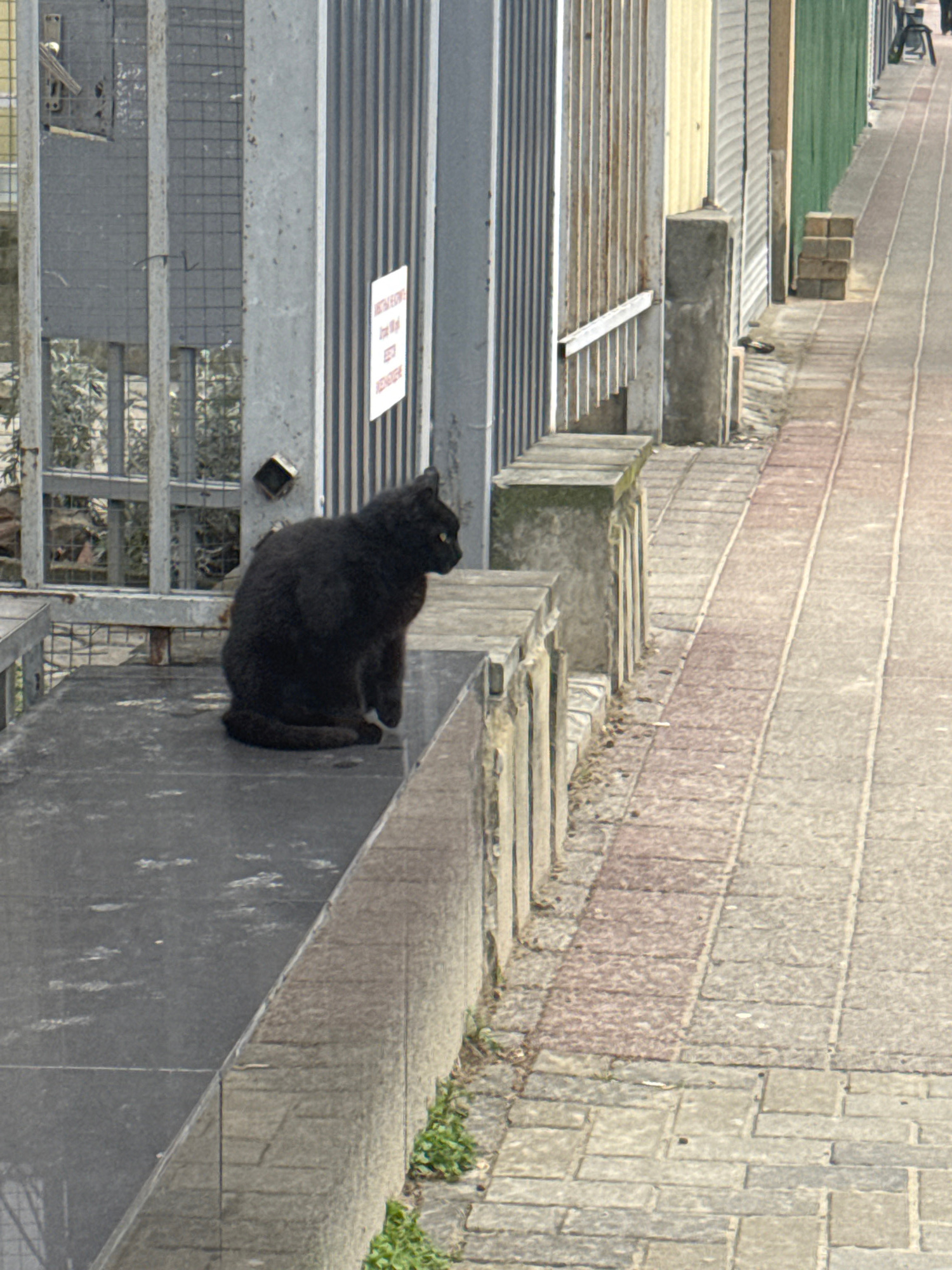 A black cat sits on a dark-colored wall bordering a multi-level structure with metal railings and what appears to be a corrugated roof. The wall runs alongside a paved walkway constructed of large, re…read more