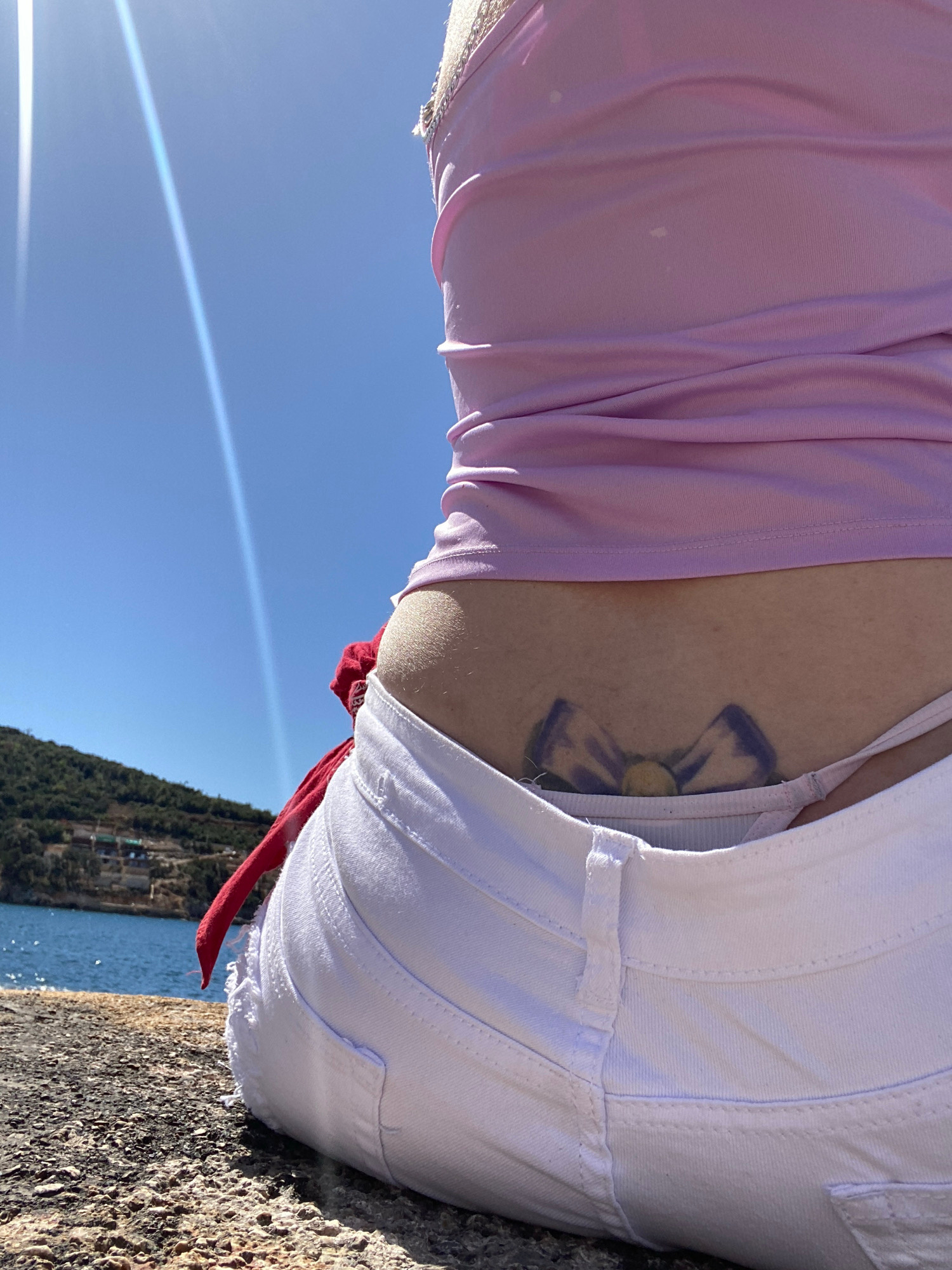 An image depicting a person's torso, likely taken outdoors. The person is wearing white shorts and a pink top. A red garment is also visible on the waist. A tattoo is noticeable on the person's skin.…read more