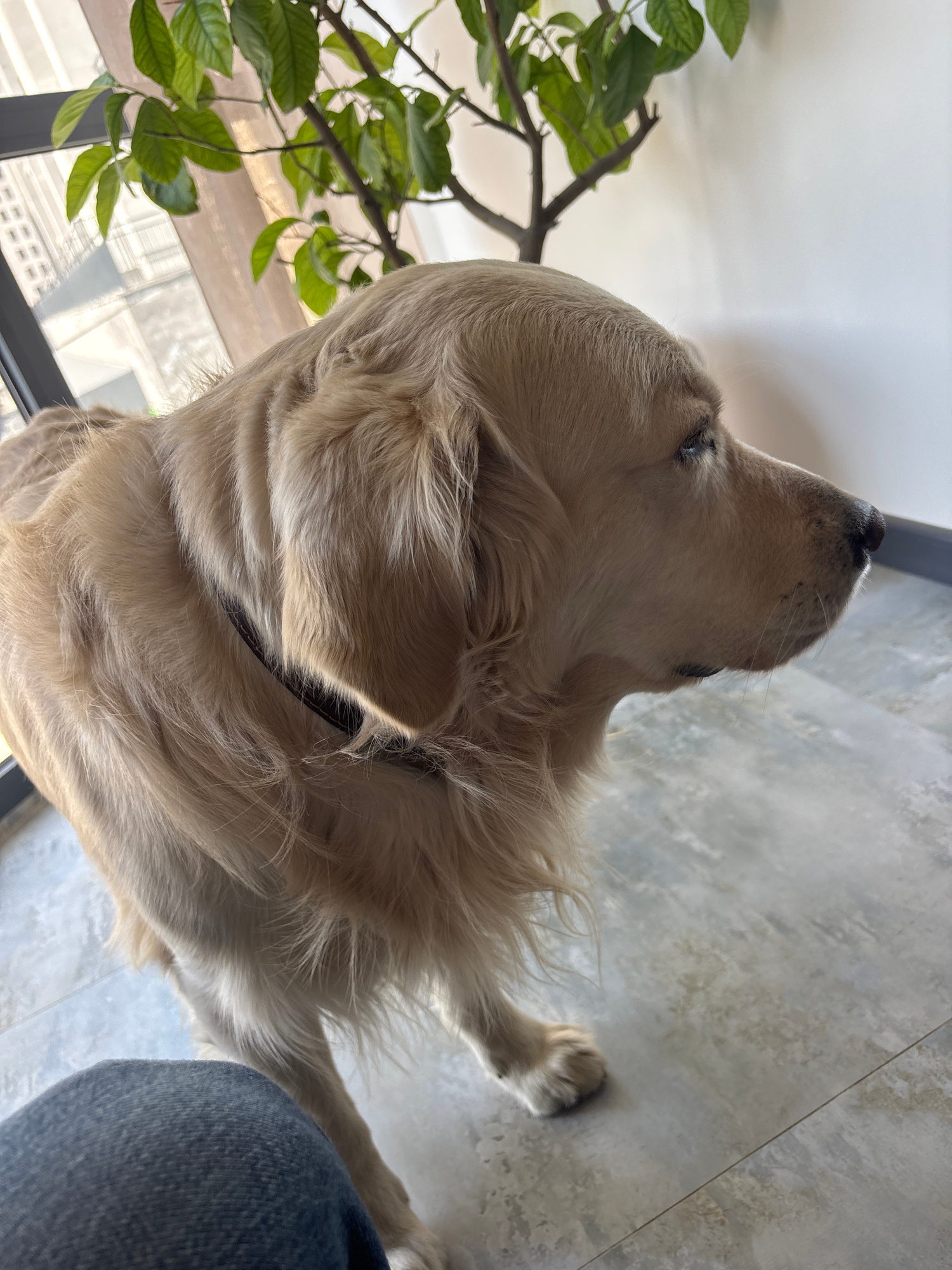 This image, captured in Zovuni, Armenia, presents a Golden Retriever dog indoors during what appears to be a bright day. The dog, a central subject, is positioned with its head turned upwards and slig…read more