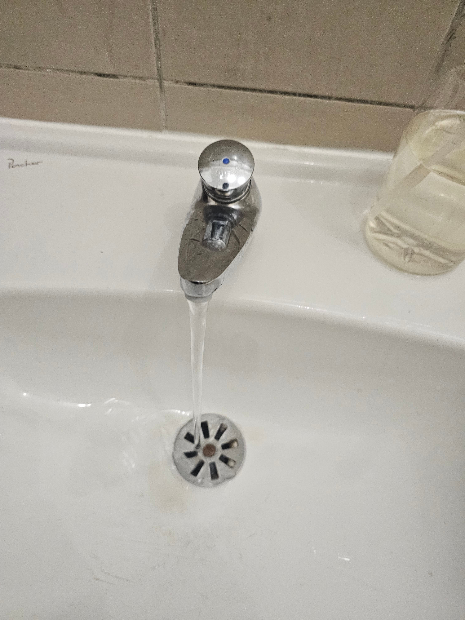 A top-down shot shows a sink with a faucet running water down the drain. The sink appears to be white and made of porcelain. The faucet is made of metal and has a blue and silver handle. Water is runn…read more