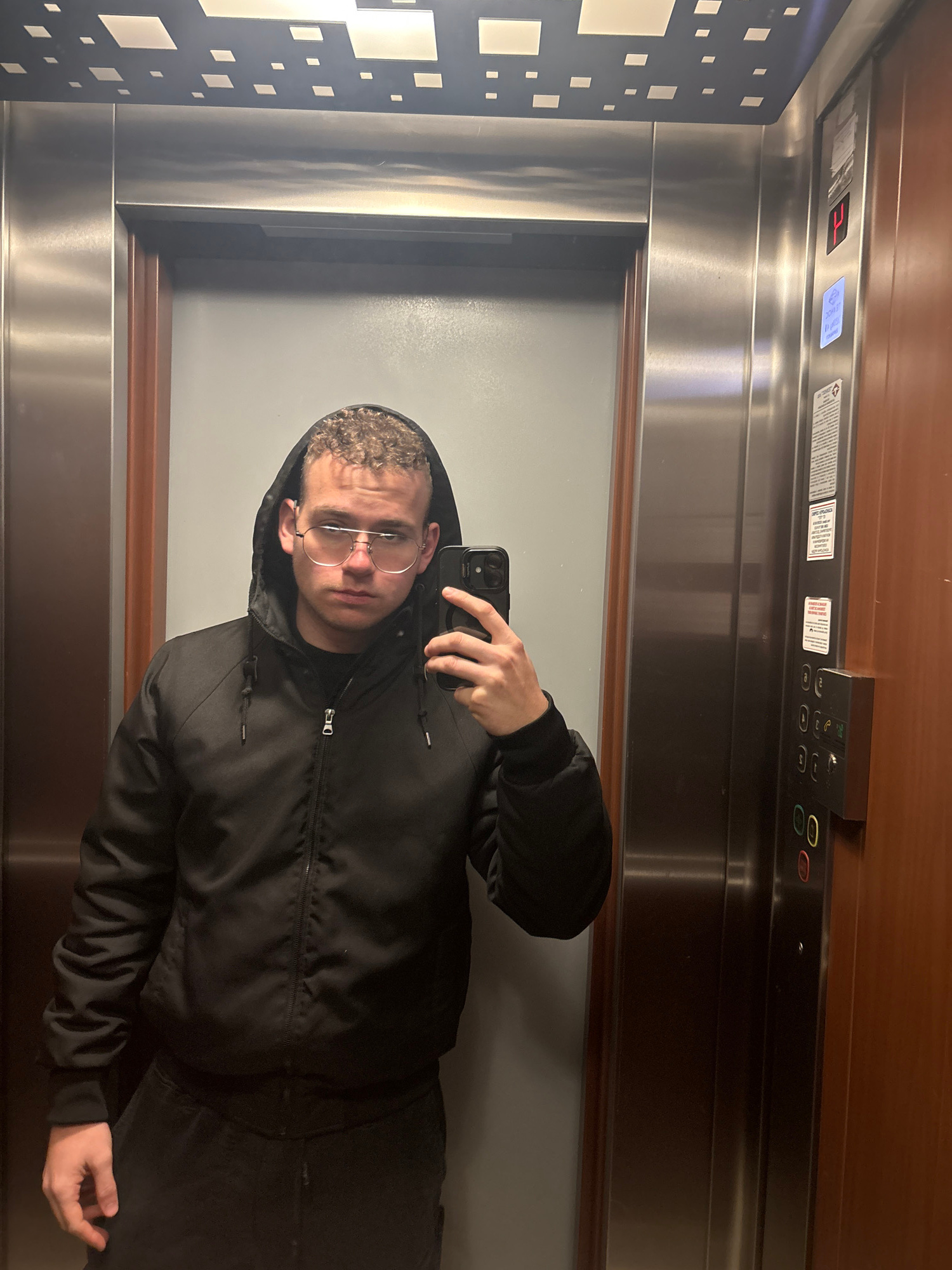 A young adult is taking a selfie in an elevator. The elevator has brushed metal walls, a dark wooden trim, and a control panel with numbered buttons. The floor indicator shows "2" in red. The individu…read more